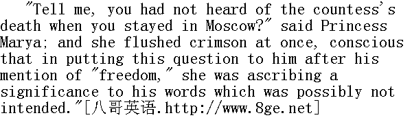 请告诉我们, 当你还在莫斯科的时候, 是不是还不知道伯爵夫人已经去世的消息?"玛丽亚公爵小姐说完后, 立刻脸就涨红了, 她发觉, 在他说了他是自由的之后, 她的话对于他没有任何意义。 "No," answered Pierre, obviously unconscious of any awkwardness in the interpretation Princess Marya had put on his allusion to his freedom. "I heard of it in Orel, and you cannot imagine how it affected me. We were not an exemplary couple," he said quickly, glancing at Natasha and detecting in her face curiosity as to how he would speak of his wife. "But her death affected me greatly. When two people quarrel, both are always in fault. And one becomes terribly aware of one's shortcomings towards any one who is no more. And then such a death ... apart from friends and consolation. I felt very sorry for her," he concluded, and noticed with satisfaction a glad look of approval on Natasha's face." 不知道, "皮埃尔回答道, 他显然并不认为玛丽亚公爵小姐对他提到的自由的理解使他难堪。"我是在奥廖尔听到的, 您难以想象, 这一消息使我多么震惊。我们并不是一对模范夫妻, "他说得很快, 说此话时向娜塔莎看了一眼, 他从她的脸部表情发觉, 她对他给予妻子的评价十分好奇。"但是她的死却使我非常震惊。两个人吵嘴时, 往往双方都有错。而我的过错, 在一个已故去的人的面前忽然变得更加严重。而且死得那么......没有朋友, 没有安慰。我非常、非常难过。"他说完后, 发觉娜塔莎的脸上露出赞赏的表情, 他感到宽慰。 "And so you are once more an eligible parti," said Princess Marya." 是啊, 您又是光棍一条了, 可以另娶妻室了。"玛丽亚公爵小姐说。 Pierre flushed suddenly crimson; and for a long while he tried not to look at Natasha. When he did venture to glance at her, her face was cold and severe, even, he fancied, disdainful. 皮埃尔突然脸涨得通红, 好一阵子不敢看娜塔莎一眼。当他鼓足勇气看她时, 她的脸色冷冰冰的、严肃的, 甚至是鄙视的。 "But did you really see and talk to Napoleon, as we have been told?" said Princess Marya." 是不是像许多人对我们讲过的。你确实见过拿破仑, 还和他讲过话呢?"玛丽亚公爵小姐问道。