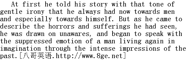 他在开始讲述的时候, 带有一种现在对人, 特别是对自己常有的一种讥笑的、温和的眼神;但是讲到后来, 当他讲到他所看见的恐怖和痛苦的情景时, 他强忍住人们在回忆那些感受强烈印象时常有的激动心情, 他忘掉了自我, 讲得入了神。 Princess Marya looked from Pierre to Natasha with a gentle smile. In all he told them she saw only Pierre and his goodness. Natasha, her head supported in her hand, and her face changing continually with the story, watched Pierre, never taking her eyes off him, and was in imagination passing through all he told her with him. Not only her eyes, but her exclamations and the brief questions she put showed Pierre that she understood from his words just what he was trying to convey by them. It was evident that she understood, not only what he said, but also what he would have liked to say and could not express in words. The episode of the child and of the woman in whose defence he was taken prisoner, Pierre described in this way. "It was an awful scene, children abandoned, some in the midst of the fire ... Children were dragged out before my eyes ... and women, who had their things pulled off them, earrings torn off ..." 玛丽亚公爵小姐面露出温和的微笑, 时而看一眼皮埃尔, 时而看一眼娜塔莎。她在这一整个故事中所看见的, 只有皮埃尔和他的那付善良的心肠。娜塔莎用手支着头, 脸上的表情随着故事情节的变化而变化着, 她一刻也不停地注视着皮埃尔, 显然, 她同他一起感受着他所讲述的故事。不仅是她的眼神, 而且还有她的感叹声和简短的提问, 都向皮埃尔表明, 她从他所讲述的故事, 她已经明白了的事情正是他想要表达出来的。很明显, 她不仅明白了他所讲述的事情, 而且还明白了他想表达出来而又难以用语言表达出来的东西。在讲到他为了保护妇女和儿童而被捕的那个插曲时, 皮埃尔是这样讲的: "这是可怕的场面, 孩子们被乱扔, 有一些被扔进火堆里......我亲眼目睹一个孩子被从火里拖出来......妇女们的东西被抢走, 耳环被扯下来......" Pierre flushed and hesitated. "Then a patrol came up and all who were not pillaging, all the men, that is, they took prisoner. And me with them." 皮埃尔红着脸, 犹豫了一下。"这时来了巡逻队, 他们把未遭抢劫的人, 所有的农民都捉走了, 我也被捉去了。" "I am sure you are not telling us all; I am sure you did something," said Natasha, and after a moment's pause, "something good."" 您大概没有把您的经历全告诉我们;您一定做了什么......"娜塔莎稍稍停顿了一下, 接着说道, "做了好事。" Pierre went on with his story. When he came to the execution, he would have passed over the horrible details of it, but Natasha insisted on his leaving nothing out. 皮埃尔继续往下讲, 当他讲到行刑的时候, 他想避开那些可怕的细节;然而娜塔莎要求他不要把任何事情遗漏掉。
