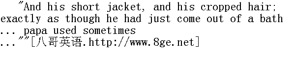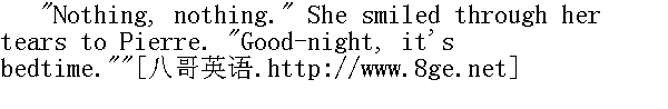 那一身短礼服和剪短了的头发, 的确像刚从浴室出来......爸爸往往......" "I can understand how he" (Prince Andrey) "cared for no one else as he did for him," said Princess Marya." 我明白, 他(安德烈公爵)从来没有像喜欢他那样喜欢过别的人。"玛丽亚公爵小姐说。 "Yes, and he is so different from him. They say men are better friends when they are utterly different. That must be true; he is not a bit like him in anything, is he?"" 是的, 他和他各有不相同的特点。人们说, 各有其特点的两个男人容易交成朋友。这个话应该是有其道理的。他们两人之间在任何方面都不相似, 不是吗?" "Yes, and he is such a splendid fellow."" 是的, 他太好了。" "Well, good-night," answered Natasha. And the same mischievous smile lingered a long while as though forgotten on her face." 好了, 再见。"娜塔莎说。那顽皮的微笑, 好像久已遗忘了似的, 长时间地停留在她的脸上。