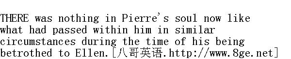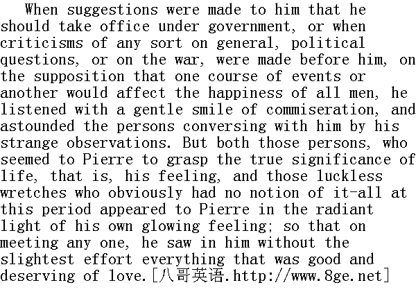 皮埃尔现在的心情, 与他在向海伦求婚时的处境虽然相似, 但心情却完全不同。 He did not go over, as he had then, with a sickening sense of shame the words he had uttered; he did not say to himself: "Oh, why did I not say that, and why, oh why, did I say then: I love you." Now, on the contrary, every word of hers and of his own, he went over in his imagination with every detail of look and smile, and wanted to add nothing, to take nothing away, he longed only to hear it over again. As for doubts- whether what he contemplated doing was right or wrong-there was never a trace of them now. Only one terrible doubt sometimes assailed his mind. Was it not all a dream? Was not Princess Marya mistaken? Am I not too conceited and self-confident? I believe in it; but all at once- and it's what is sure to happen-Princess Marya tells her; and she smiles and answers: "How queer! He has certainly made a mistake. Doesn't he know that he is a man, a mere man, while I? ... I am something altogether different, higher." 他从来不愿意重复他当时带着一种病态的羞愧心情对海伦说出的那些话, 他不会对自己说: "哎呀, 我为什么不说这一点, 为什么, 为什么我当时说'Jevousaime'①?"相反, 他现在重复着她说过的每一句话和他说过的每一句话, 既不添加一个字, 也不减少一个字, 在他头脑中像过电影似的, 详细地回顾了她的表情和她的微笑, 他现在所想的只是不停地重复。他对自己所做的事情是好还是坏, 连一丝一毫怀疑的影子也不存在了。只有一团可怕的疑云不时在头脑中掠过。所有这一切莫非是在做梦吧?玛丽亚公爵小姐没有弄错了吧?我是不是太自负, 或者是太自信了呢?我有信心;可是突然之间说不定会发生这种事: 玛丽亚公爵小姐告诉了她, 她一定会微微一笑, 回答她说: "真是太奇怪了!他多半是弄错了。难道他不知道他自己是一个什么样的人, 是一个普普通通的人嘛!可是我呢?......我则完全不同, 我是另一种人, 高尚的人。" ①法语: 我爱您。 This doubt alone often beset Pierre. He made no plans of any sort now. The happiness before him seemed to him so incredible that the only thing that mattered was to bring it to pass, and nothing could be beyond. Everything else was over. 只有这团疑云常常在他的脑海中掠过, 他现在也还没有制定任何计划。他似乎觉得眼前的这个幸福是那么不可思议, 然而, 他只要能够得到它, 往后就不再会有什么事了, 一切都圆满告终了。 A joyful, unexpected frenzy, of which Pierre had believed himself incapable, seized upon him. The whole meaning of life, not for him only, but for all the world, seemed to him centred in his love and the possibility of her loving him. Sometimes all men seemed to him to be absorbed in nothing else than his future happiness. It seemed to him sometimes that they were all rejoicing as he was himself, and were only trying to conceal that joy, by pretending to be occupied with other interests. In every word and gesture he saw an allusion to his happiness. He often surprised people by his significant and blissful looks and smiles, that seemed to express some secret understanding with them. But when he realised that people could not know of his happiness, he pitied them from the bottom of his heart, and felt an impulse to try to make them somehow understand that all that they were interested in was utter nonsense and trifles not deserving of attention. 一种令人喜悦的、意外的疯狂支配着皮埃尔, 而这种喜悦和疯狂是他从前不认为自己也会有的。人生的全部意义, 不仅对于他一个人, 而是对整个世界来说, 他觉得只在于他的爱情, 只在于她能不能爱他, 有时候, 他觉得所有的人所忙的就只有一件事--就是为他们的未来的幸福而奔忙。有时候, 他又觉得, 所有的人都同他一样高兴, 只不过他们尽力掩饰这种高兴, 假装他们的兴趣在其他方面罢了。他把人们的一言一行都看作是对他的幸福所作的暗示。他经常以他那意味深长的自己感到幸福的目光和微笑(似乎他们之间已有默契), 使遇见他的人感到吃惊。但是, 当他明白了人家可能尚不知道他的幸福的时候, 他就十分可怜他们, 并且想对他们加以解释, 他们所忙碌的一切都只不过是一种不值得注意的无足轻重的一些小事罢了。