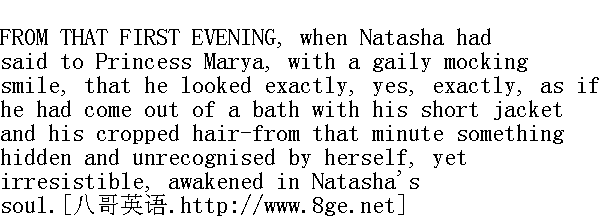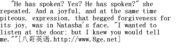 他说了?是吗?他说了?"她翻来覆去地说道。娜塔莎脸上露出欢喜的、同时又是怪可怜的、为这种欢喜请求原谅的表情。"我原本想在门口听的;但是, 我知道你一定会告诉我。" Ready as Princess Marya was to understand and to be touched by the expression with which Natasha looked at her, and much as she felt for her agitation, yet her words for the first moment mortified her. She thought of her brother and his love. 对于娜塔莎看她的那种眼神, 尽管玛丽亚公爵小姐已经非常理解, 已经非常感动;尽管娜塔莎那激动的样子确实令人同情;然而, 娜塔莎所说的话, 在最初的一刹那间仍然使玛丽亚公爵小姐感到屈辱。她想起了哥哥, 想起了他的爱情。 "But what is one to do? She cannot help it," thought Princess Marya; and with a sad and somewhat severe face she repeated to Natasha all Pierre had said to her. Natasha was stupefied to hear he was going to Petersburg. "To Petersburg!" she repeated, as though unable to take it in." 可是有什么办法呢!她不能不这样, "玛丽亚公爵小姐想;于是她带着忧郁的、有几分严肃的表情, 把皮埃尔对她说的话全都告诉了娜塔莎。听说皮埃尔要动身去彼得堡;娜塔莎吃了一惊。"去彼得堡!"她重复说, 似乎没有听懂似的。 But looking at the mournful expression of Princess Marya's face she divined the cause of her sadness, and suddenly burst into tears."Marie," she said, "tell me what I am to do. I am afraid of being horrid. Whatever you say, I will do; tell me ..." 但是当她一看玛丽亚公爵小姐脸上忧郁的神情, 就猜到了她难过的原因, 她突然哭了起来。"玛丽, "她说, "告诉我, 我应当怎么办: 我生怕会做出傻事来;你告诉我该怎么办我就怎么办;告诉我吧......" "You love him?"" 你爱他吗?"