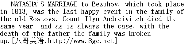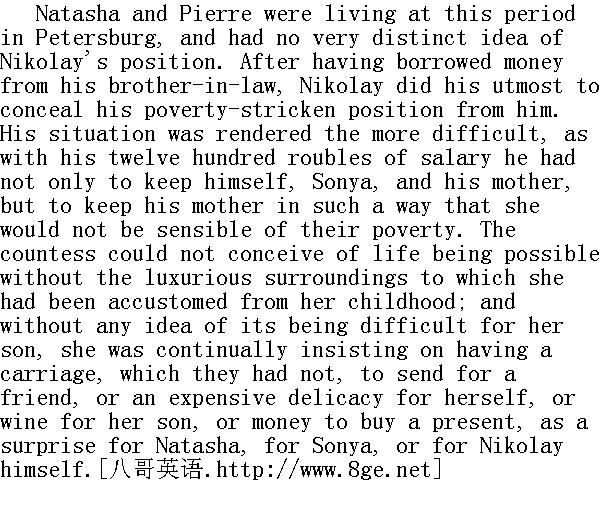 娜塔莎和皮埃尔这时住在彼得堡, 不太了解尼古拉的困境。尼古拉向妹夫借了钱, 但竭力掩饰他的窘境, 尼古拉的处境特别为难, 因为他要用一千二百卢布养活自己、索尼娅和母亲, 而且还不能让母亲知道他们家已十分穷困。伯爵夫人简直无法想象如果缺乏她从小过惯的奢侈环境怎样生活下去, 她不知道儿子有多艰难, 还不断提出各种要求: 时而要马车去接熟人(此时他们家已没有马车了), 时而为自己要佳肴美食或者为儿子要美酒, 时而要钱为娜塔莎、索尼雅和尼古拉买一件他们意想不到的高级礼物。 Sonya kept house, waited on her aunt, read aloud to her, bore with her caprices and her secret dislike, and helped Nikolay to conceal from the old countess their poverty-stricken position. Nikolay felt himself under a debt of gratitude to Sonya that he could never repay, for all she did for his mother; he admired her patience and devotion, but he tried to keep himself aloof from her. 索尼娅料理家务, 侍奉姑母, 念书给她听, 忍受她的任性和内心中对她的嫌恶, 帮助尼古拉向老公爵夫人隐瞒他们经济上的窘迫。尼古拉因索尼娅尽心尽力照顾母亲, 对她感激不尽。他赞赏她的耐心和忠诚, 却竭力疏远她。 In his heart he seemed to feel a sort of grudge against her for being too perfect, and for there being no fault to find with her. She had all the good qualities for which people are valued, but little of what would have made him love her. And he felt that the more he valued her the less he loved her. He had taken her at her word when she had written to him giving him his freedom, and now he behaved with her as though what had passed between them had been long, long ago forgotten, and could never under any circumstances be renewed. 他在心里责怪她, 好像就因为她十分完美, 几乎无法责怪她, 她有一切为人们所珍惜的品德, 可是就缺少使他爱的东西。他觉得他越是赞赏她的为人、她的品德, 就越是爱不起来。她过去在信中写到她给他自由的诺言, 现在他对她的态度, 就像过去的一切老早老早就给忘记了, 再也无法挽回了。 Nikolay's position was becoming worse and worse. His hope of laying by something out of his salary proved to be an idle dream. Far from saving anything, he was even running up some small debts to satisfy his mother's exigencies. There seemed no means of escape from his position. The idea of marrying a rich heiress, which his female relatives suggested, was repulsive to him. The only other solution of his difficulties-the death of his mother-never entered his head. He desired nothing, and hoped for nothing; and at the bottom of his heart he took a stern and gloomy satisfaction in the unrepining endurance of his position. He tried to avoid his old acquaintances, with their commiseration and their mortifying offers of assistance; shunned every sort of entertainment and amusement; and even at home did nothing but play patience with his mother, pace silently about the room, and smoke pipe after pipe. He seemed studiously to maintain in himself that gloomy temper, which alone enabled him to bear his position. 尼古拉的处境每况愈下。从薪金里攒点钱, 显然是不切实际的幻想。他不仅攒不了钱, 而且为了满足母亲的要求, 又借了几笔小债。他找不到摆脱困境的办法。亲戚们劝他娶一位有钱的姑娘, 他颇为反感。摆脱困境的另一条出路--母亲去世, 他从来没有想到过, 他没有任何心愿, 不抱任何希望, 在逆境中不发牢骚, 没有怨言, 而在内心深处却享受一种忧郁而严峻的欢乐。他竭力避开过去的熟人, 避开他们的同情和令人屈辱的帮助。他摆脱一切娱乐消遣, 甚至在家里也不做什么, 只和母亲玩玩牌, 在室内默默地踱步, 一袋接着一袋地吸烟。他似乎竭力保持忧郁的心情, 仿佛只有这样才能忍受他的处境。