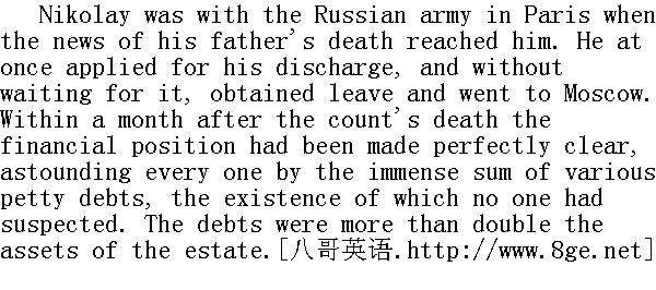 尼古拉接到父亲去世的噩耗时, 正随着俄国军队驻在巴黎。他立刻提出辞职, 不等批准, 就请假回莫斯科。伯爵死后一个月, 家里的经济情况就弄清楚了。虽然谁都知道伯爵负债累累, 这些零星债务的数额之大令人吃惊。负债的总数比家产大上一倍。 The friends and relations advised Nikolay to refuse to accept his inheritance. But Nikolay looked on such a refusal as a slur on the honoured memory of his father; and so he would not hear of such a course, and accepted the inheritance with the obligation of paying the debts. 亲友们劝尼古拉不要接受遗产。但是尼古拉认为拒绝接受遗产是孝子对亡父的神圣纪念的亵渎, 因此没有听取劝告, 毅然承担起还债的义务。 The creditors, who had so long been silent, held in check during the old count's lifetime by the vague but powerful influence of his easy good-nature, all beset Nikolay at once. There seemed, as so often happens, a sort of rivalry among them, which should get paid first; and the very people, such as Mitenka and others, who held promissory notes, not received in discharge of debts, but as presents, were now the most importunate of the creditors. They would give Nikolay no peace and no respite, and those who had shown pity for the old man, who was responsible for their losses (if they really had lost money by him), were now ruthless in their persecution of the young heir, who was obviously guiltless as far as they were concerned, and had voluntarily undertaken to pay them. 伯爵在世时, 由于他生性善良, 人缘较好, 债主们慑于他那种难以捉摸的强大影响, 以前一直不好开口, 如今却蜂拥而至上门要债。就像一般情况那样, 债主们争着首先得到债款, 像米坚卡等持有赠予期票的人, 现在就成为讨债最急的人了。那些原来可怜老伯爵(似乎他使他们受到损失)(就算受过损失)的人, 现在却不肯放宽尼古拉的还债期限, 也不给他喘息的机会, 现在也毫不留情地向那个显然没欠他们帐却自愿承担债务的年轻人逼债。 Not one of the plans that Nikolay resorted to was successful: the estate was sold by auction at half its value, and half the debts remained still unpaid. Nikolay accepted a loan of thirty thousand roubles offered him by his brother-in-law Bezuhov; and paid that portion of the debts that he recognised as genuine obligations. And to avoid being thrown into prison for the remainder, as the creditors threatened, he once more entered the government service. 尼古拉所设想的周转办法没有一种获得成功, 地产以半价卖出去了, 但仍有一半债务未能偿还。尼古拉接受了妹夫别祖霍夫借给他的三万卢布, 以偿还他认为欠的是现款的真正的债款, 他为了不致为余下的债务而坐牢(债主们以此威胁他), 他只有重新去任公职。 To return to the army, where at the next promotion he would have been colonel, was out of the question, because his mother now clung to her son as her one hold on life. And so in spite of his disinclination to remain in Moscow, in the midst of a circle of acquaintances who had known him in former days, in spite of his distaste for the civil service, he accepted a civilian post in Moscow, and taking off his beloved uniform, established himself in a little lodging in Sivtsevoy Vrazhok with his mother and Sonya. 虽然重返军队可以补上团长的空缺, 但他不能去, 因为母亲现在把儿子当作她生活中唯一的倚靠, 抓住他不放。因此, 尽管他不愿留在莫斯科熟人中间, 尽管他讨厌文职工作, 他还是在莫斯科找了一个文官职务。这样, 他就脱下心爱的军服, 同母亲和索尼娅搬到西夫采夫·弗拉若克区一所小住宅里。