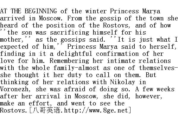 初冬, 玛丽亚公爵小姐来到莫斯科。她从城里传闻得知罗斯托夫家的情况, 还听说: "当儿子的为母亲自我牺牲"-- 城里人都这么说。"我就知道他是这样一个人。"玛丽亚公爵小姐对自己说, 她觉得她还是爱他的, 不由得心中一阵喜悦。她回顾她家和罗斯托夫全家旧日的交情, 几乎像一家人那么亲密地觉得她应当去看他们。但一想到在沃罗涅日她同尼古拉的关系, 又害怕起来。不过在莫斯科待了几个星期后, 她还是鼓足勇气去拜访罗斯托夫一家。 Nikolay was the first to meet her, since it was impossible to reach the countess's room without passing through his room. Instead of the expression of delight Princess Marya had expected to see on his face at the first glance at her, he met her with a look of chilliness, stiffness, and pride that she had never seen before. Nikolay inquired after her health, conducted her to his mother, and, after staying five minutes, went out of the room. 第一个迎接她的人是尼古拉, 因为去伯爵夫人那里必须先经过他的房间。向玛丽亚公爵小姐第一眼看去时, 尼古拉脸上的表情不是她所一直期待的欣喜之情, 而是一种她从未见到过的冷淡和高傲。尼古拉向她问了好, 把她领到母亲屋里, 坐了四五分钟就走了。 When Princess Marya left the countess, Nikolay again met her, and with marked formality and stiffness led her to the hall. He made no reply to her remarks about the countess's health. ''What is it to you? Leave me in peace,'' his expression seemed to say. 公爵小姐从伯爵夫人屋里出来, 尼古拉又迎着她, 冷淡又一本正经地把她送到前厅, 她提起伯爵夫人的健康时他一句话也没有回答。"这关您什么事?别打扰了我的平静!"他的眼神似乎这么说。 ''And why should she stroll in here? What does she want? I can't endure these ladies and all these civilities!'' he said aloud before Sonya, obviously unable to restrain his vexation, after the princess's carriage had rolled away from the house." 她闯到这里来干什么?她要干什么呀?我实在受不了这些阔小姐和她们的客套!"等公爵小姐的马车一走, 他显然控制不住心中的怒气, 当着索尼娅的面大声说。 ''Oh, how can you talk like that, Nicolas,'' said Sonya, hardly able to conceal her delight. ''She is so kind, and maman is so fond of her.''" 哎呀, 你怎么可以这样说呢?!尼古拉!"索尼娅几乎掩饰不住自己内心中的喜悦, 说。"她是那么善良, 妈妈又那么爱她。"