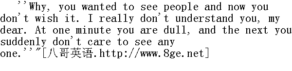 你原来说要见见人, 现在又不要见人了。宝贝儿子, 我真弄不明白。你一会儿闷得慌, 一会儿又不要见人。" ''Why, I never said I was dull.''" 我又没说过我闷得慌。" ''Why, you said yourself you did not even wish to see her. She is a very good girl, and you always liked her; and now all of a sudden you have some reasons or other. Everything is kept a secret from me.''" 什么, 你不是说你连见都不愿见她吗?她可是个好姑娘, 你一向喜欢她, 可现在不知什么缘故, 什么事都瞒着我。" ''Not at all, mamma.''" 我一点也没有瞒你, 妈妈。" ''If I were to beg you to do something unpleasant, but as it is, I simply beg you to drive over and return her call. Why, civility demands it, I should suppose ... I have begged you to do so, and now I will meddle no further since you have secrets from your mother.''" 如果我求你做什么不愉快的事, 倒也罢了, 我只不过求你回访一次。这是应尽的礼数......我求过你了, 既然你有事瞒着母亲, 我就再不过问你的事了。"