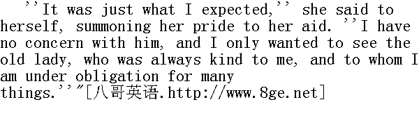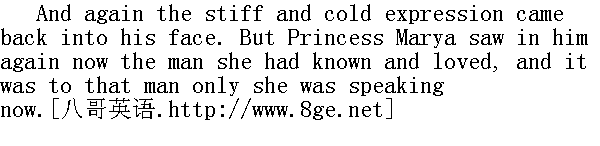 于是他的眼神又像原来一样冷淡。但公爵小姐又从他身上看到原来那个熟悉而心爱的人, 而她现在就正在同这个人谈话。 ''I thought you would allow me to say that,'' she said. ''I have been such intimate friends with you ... and with your family, and I thought you would not feel my sympathy intrusive; but I made a mistake,'' she said. Her voice suddenly shook. ''I don't know why,'' she went on, recovering herself, ''you used to be different, and ...''" 我想您会让我说这些话吧, "她说, "我同您......同您一家那么亲近, 所以我想您不会认为我的同情是不适当的。但我想错了, "她说。此时, 她的声音突然颤抖了。"我不知道为什么, "她镇定下来继续说, "您以前不是这样的......" ''There are thousands of reasons why.'' (He laid special stress on the word why.) ''I thank you, princess,'' he added softly. ''It is sometimes hard ...''" 为什么--这个为什么有上千条原因(他特别加重说了为什么这三个字)。谢谢您, 公爵小姐, "他低声说。"有时心中好难受啊!" ''So that is why! That is why!'' an inner voice was saying in Princess Marya's soul. ''Yes, it was not only that gay, kind, and frank gaze, not only that handsome exterior I loved in him; I divined his noble, firm, and self-sacrificing soul,'' she said to herself." 原来如此!原来如此!"公爵小姐内心的声音在说。"对, 我爱他, 不光爱他那快乐、善良和开朗的眼神, 不光爱他俊俏的外表, 我看到他有一颗高尚、刚强和不惜自我牺牲的心, "她在心里自言自语。" ''Yes, he is poor now, and I am rich ... Yes, it is only that ... Yes, if it were not for that ...'' And recalling all his former tenderness, and looking now at his kind and sad face, she suddenly understood the reason of his coldness. 是啊!他现在很穷, 可我有钱......是啊!就是因为这个......是啊;如果情况不是这样......"她想起他原来的柔情, 此刻望着他那善良的、忧郁的脸、她忽然明白了, 他为什么冷淡的原因。