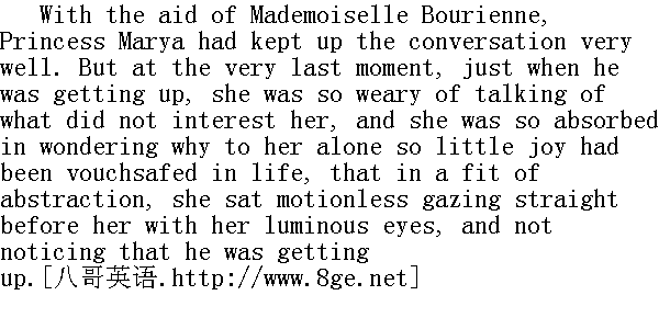 在布里安小姐的协助下, 公爵小姐总算顺利地进行了这场谈话。但是就在最后一分钟, 当尼古拉站起来告辞的那个时刻, 公爵小姐感到这种敷衍性交谈令人十分疲劳, 又想到为什么生活对她个人给予的欢乐是这么少--这种思绪如此萦绕着她的心, 以致她突然感到心神恍惚, 她那双明亮的眼睛凝视着前方, 没有注意到尼古拉已经起立, 而她仍然坐在那儿不动。 Nikolay looked at her, and anxious to appear not to notice her abstraction, he said a few words to Mademoiselle Bourienne, and again glanced at the princess. She was sitting in the same immovable pose, and there was a look of suffering on her soft face. He felt suddenly sorry for her, and vaguely conscious that he might be the cause of the sadness he saw in her face. He longed to help her, to say something pleasant to her, but he could not think what to say to her. 尼古拉看了看她, 想假装没有看出她的走神, 就跟布里安小姐谈了几句话, 又看了一眼公爵小姐。她依旧坐在那儿不动, 和善的脸上现出痛苦的神色。他忽然可怜起她来并模模糊糊地意识到可能是他伤了她的心, 使她脸上现出哀怨的表情, 他想帮助她, 对她说些愉快的话, 但想不出说什么才好。 ''Good-bye, princess,'' he said. She started, flushed, and sighed heavily." 再见, 公爵小姐。"他说。她省悟过来, 脸涨得通红, 深深地叹了一口气。 ''Oh, I beg your pardon,'' she said, as though waking from sleep. ''You are going already, count; well, good-bye! Oh, the cushion for the countess?''" 哦, 对不起!"她说, 仿佛刚苏醒过来, "您要走了, 伯爵, 那么, 再见!那么给伯爵夫人的枕头呢?" ''Wait a minute, I will fetch it,'' said Mademoiselle Bourienne, and she left the room." 等一等, 我这就去取。"布里安小姐说, 走出了房门。