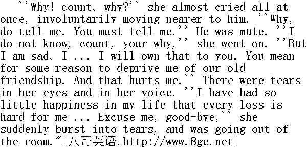 为什么, 伯爵, 究竟为什么?"她向前凑近他, 情不自禁地大声说, "告诉我, 为什么?您将告诉我。"他不吭声。"伯爵, 我知道您为什么, "她继续说。"可是, 我心里感到很难过, 我......我向您承认这一点。您为什么要使我失去我们原来的友谊。这使我深感痛心。"她喉咙里哽咽着, 眼里含着泪。"我的生活里本来就很少有幸福, 因此失去任何东西都使我更加难过......原谅我, 再见。"她突然哭起来, 走出屋去。 ''Princess! stay, for God's sake,'' he cried, trying to stop her. ''Princess!''" 公爵小姐!看在上帝份上, 等一下!"他喊道, 竭力拦住她。"公爵小姐!" She looked round. For a few seconds they gazed mutely in each other's eyes, and the remote and impossible became all at once close at hand, possible and inevitable. 她回过头来, 看着他, 他们默默地相视了几秒钟, 于是那遥远的原本不可能的事情, 突然一下子变成了眼前的, 即将成为现实的甚至是无法避免的事情了。