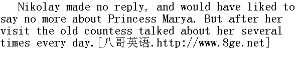 尼古拉没有回答, 他根本不想再谈到公爵小姐。但自从公爵小姐来访后, 伯爵夫人每天都要几次提到她。 She sang her praises; insisted that her son should go and see her; expressed a wish to see more of her; and yet was always out of temper when she had been talking of her. 伯爵夫人夸奖她, 她要儿子到她那儿去一次, 并表示想常常看到她。但是, 一谈到公爵小姐时, 夫人总觉得心中不是滋味。 Nikolay tried to say nothing when his mother talked of Princess Marya, but his silence irritated her. 做母亲的一提起公爵小姐, 尼古拉总是不作声, 他的沉默更惹急了母亲。 ''She is a very good and conscientious girl,'' she would say, ''and you must go and call on her. Anyway, you will see some one; and it is dull for you, I expect, with us.''" 她可是个又贤惠, 又可爱的好姑娘"她说, "你应该去看看她, 你总得去见见人, 要不老和我们在一起, 会憋死的, 我这样想着。" ''But I don't at all wish to, mamma.''" 我一点不想去见人, 妈妈。"