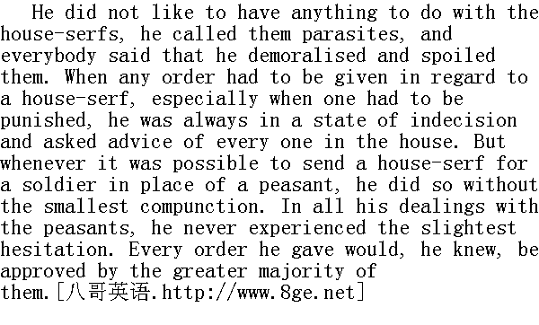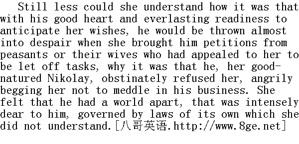 她更不了解的是, 这个心地善良、事事顺她意的人, 一听到她替农妇式农夫求情免除他们的劳役时, 为什么就会露出绝望的神情, 为什么善心的尼古拉坚决拒绝她, 他很气忿地叫她不要过问那与她无关的事。她觉得他有一个特殊的世界, 他十分热爱那个世界, 而她却不懂那个世界的某些规章制度。 Sometimes trying to understand him she would talk to him of the good work he was doing in striving for the good of his serfs; but at this he was angry and answered: ''Not in the least; it never even entered my head; and for their good I would not lift my little finger. That's all romantic nonsense and old wives' cackle-all that doing good to one's neighbour. I don't want our children to be beggars; I want to build up our fortunes in my lifetime; that is all. And to do that one must have discipline, one must have strictness ... So there!'' he would declare, clenching his sanguine fist. ''And justice too-of course,'' he would add, ''because if the peasant is naked and hungry, and has but one poor horse, he can do no good for himself or me.'' 她有时竭力想了解他, 对他谈起他的功劳在于给农奴做了好事, 他一听就恼了, 他回答说: "根本不是这么回事, 我从来没有这么想过, 我也没有为他们谋福利。什么为他人谋幸福, 全都是说得漂亮, 全都是娘们的胡扯。我可不愿让我的孩子们上街去要饭, 我活一天, 就要理好我的家业, 就是这样。为了做到这一点, 就要立个好规矩, 必须严格管理, 就是这样。"他激动地握紧拳头说。"当然也要公平合理, "他又说, "因为, 如果农民缺衣少食, 家里只有一匹瘦马, 那他既不能为他自己干好活, 也不能给我干什么活了。" And doubtless because Nikolay did not allow himself to entertain the idea that he was doing anything for the sake of others, or for the sake of virtue, everything he did was fruitful. His fortune rapidly increased; the neighbouring serfs came to beg him to purchase them, and long after his death the peasantry preserved a reverent memory of his rule. ''He was a master ... The peasants' welfare first and then his own. And to be sure he would make no abatements. A real good master-that's what he was!'' 也许, 正因为尼古拉没有让自己想到他是在为别人做好事, 是在乐善好施, 于是他所做的一切都是那么富于成效, 他的财富迅速增加, 邻庄的农奴都来请求把他们买过去。就在他死后很久, 农奴们还念念不忘他的治理才能。""他是个好东家, ......把农民的事放在前头, 自己的事放在后头。可是他对人并不姑息。没说的--一个好东家。"