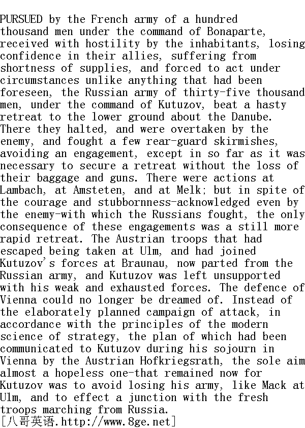 库图佐夫统率的三万五千官兵的俄国军队, 在波拿巴指挥的十万法国军队追击时受到怀有敌意的居民的冷遇, 深感军队粮饷的不足, 已不再信任盟国, 俄军不顾预见到的战争环境, 被迫采取军事行动, 遂经由多瑙河下游仓惶退却, 而在敌军追赶的地区却停止前进, 仅为配合撤退, 不损失重型装备才开展后卫战斗。在兰巴赫、阿姆施特滕、梅尔克附近双方曾经作战, 俄军与敌军交锋时英勇刚毅, 已为敌军所公认;虽然如此, 但是这几次战役均以俄军迅速撤退而告终。奥国军队在乌尔姆附近虽幸免被俘, 并与库图佐夫在布劳瑙会师, 而现今竟与俄国军队分立。库图佐夫兵力不足, 装备很差, 疲惫不堪, 只得听之任之了。保卫维也纳的事已无可考虑。库图佐夫在维也纳期间, 奥国军事参议院曾经送交他一份依据新科学规律酌情拟定的进攻性战略方案, 但是目前库图佐夫部下向他提出的一项近乎难以达到的目标却已摒除以上的战略, 其旨意在于联合来自俄国的军队, 不重蹈马克在乌尔姆近郊损兵折将、全军被歼的覆辙。 On the 28th of October, Kutuzov took his army across to the left bank of the Danube, and then for the first time halted, leaving the Danube between his army and the greater part of the enemy's forces. On the 30th he attacked Mortier's division, which was on the left bank of the Danube, and defeated it. In this action for the first time trophies were taken-a flag, cannons, and two of the enemy's generals. For the first time, after retreating for a fortnight, the Russian troops had halted, and after fighting had not merely kept the field of battle, but had driven the French off it. Although the troops were without clothing and exhausted, and had lost a third of their strength in wounded, killed, and missing; although they had left their sick and wounded behind on the other side of the Danube, with a letter from Kutuzov commending them to the humanity of the enemy; although the great hospitals and houses in Krems could not contain all the sick and wounded,-in spite of all that, the halt before Krems and the victory over Mortier had greatly raised the spirits of the troops. Throughout the whole army, and also at headquarters, there were the most cheerful but groundless rumours of the near approach of the columns from Russia, of some victory gained by the Austrians, and of the retreat of Bonaparte panic-stricken. 十月二十八日, 库图佐夫带领军队横渡多瑙河抵达左岸, 头一次驻扎下来, 与法国人的主力分据于多瑙河两岸。三十日, 库图佐夫攻打驻守在多瑙河左岸的莫蒂埃师团, 把它击溃了。在这次战役中, 头一回赢得了战利品: 军旗、大炮和两名敌军将领。在两个星期的撤退之后, 俄国军队头一次留驻下来, 在一场争斗以后, 不仅守住了战地, 而且驱逐了法国人。虽然这些军队缺少衣服, 疲惫不堪, 掉队、伤亡和患病的人员占三分之一, 削弱了兵力;虽然一些伤病员持有库图佐夫的手谕留在多瑙河对岸(手谕中暗示: 听任敌人赐予他们仁慈的照拂);虽然克雷姆斯的大病院和住房都已变成军医院, 但是仍然容纳不了全部伤病员, 尽管如此, 在克雷姆斯驻留和对莫蒂埃的胜利在颇大程度上提高了部队的士气。在全军之中和在大本营中都散布着令人喜悦、虽然并非真实的传闻, 说什么俄国纵队即将来临、奥国人赢得大捷, 吓破胆的波拿巴撤退了。 Prince Andrey had been during the engagement in attendance on the Austrian general Schmidt, who was killed in the battle. His horse had been wounded under him, and he had himself received a slight wound on his arm from a bullet. As a mark of special favour on the part of the commander-in-chief, he was sent with the news of this victory to the Austrian court, now at Brunn, as Vienna was threatened by the French. On the night of the battle, excited, but not weary (though Prince Andrey did not look robustly built, he could bear fatigue better than very strong men), he had ridden with a despatch from Dohturov to Krems to Kutuzov. The same night he had been sent on with a special despatch to Brunn. This commission, apart from its reward, meant an important step in promotion. 作战期间, 安德烈公爵曾在这次战役中捐躯的奥地利将军施米特身边服役。他骑的马负了伤, 他本人也被子弹擦伤一只手, 伤势轻微。多亏总司令给予特殊照顾, 他携带大捷的消息被派至奥国宫廷;法国军队的威胁引起宫廷恐惧, 奥国宫廷已经不在维也纳, 而在布吕恩。作战的深夜, 安德烈公爵激动不安, 并不感到困倦, 虽然看起来他的身体虚弱, 但是他比那些最强壮的人更能经受住劳累, 他骑上马, 随身带着多赫图罗夫的情报前往克雷姆斯晋谒库图佐夫。当天夜晚安德烈公爵充当信使被派往布吕恩。执行信使这一职务, 除获得奖励而外, 还意味他向升迁的路上迈出一大步。 The night was dark and starlit; the road looked black in the white snow that had fallen on the day of the battle. With his mind filled with impressions of the battle, joyful anticipations of the effect that would be produced by the news of the victory, and recollections of the farewells of the commander-in-chief and his comrades, Prince Andrey trotted along in a light posting cart, with the sensations of a man who, after long waiting, has at last attained the first instalment of some coveted happiness. As soon as he closed his eyes, the firing of guns and cannons was echoing in his ears, and that sound blended with the rattle of the wheels and the sensation of victory. At one moment he would begin to dream that the Russians were flying, that he was himself slain; but he waked up in haste, and with fresh happiness realised anew that t