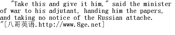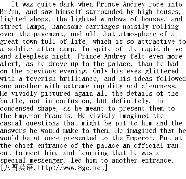 当安德烈公爵乘车驶入布吕恩的时候, 天色已经黑了, 他看见周围有一栋栋高大的楼房, 商店和住宅的窗户里灯火通明, 一排排路灯闪烁着耀眼的光辉, 豪华的马车沿着石板马路驶行, 发出辚辚的响声, 这正是热热闹闹的大城市的气氛, 对那个度过一段兵营生涯的军人来说, 这种气氛真是十分诱人的。虽然安德烈公爵快马加鞭, 彻夜不眠, 但是在他驶近皇宫时, 他觉得自己比前夜精神更加抖擞。只是他那对眼睛闪烁着狂热之光。他的心绪万千, 接踵而至, 思路极其敏捷而且清晰。他的思想上又很生动地浮现出作战的详细情节, 这种想象已经不是模糊的, 而是合乎逻辑的。他想简单而扼要地向弗朗茨皇帝禀告实情。他的思想上很生动地浮现出一些偶然提出的问题以及他对这些问题作出的回答。他原以为马上有人带他去觐见皇帝。但在皇宫正门前, 有一名官员向他跑来, 一眼认出他是信差, 就把他领到另一道门前。 "Turning to the right out of the corridor, Euer Hochgeboren, you will find the adjutant on duty," the official said to him. "He will conduct you to the minister of war." "EuerHochgeboren ①, 沿着走廊向右转, 您可以找到值班的侍从武官, "这名官员对他说, "他会带您去见军政大臣。" ①德语: 大人。 The adjutant on duty, meeting Prince Andrey, asked him to wait, and went into the war minister. Five minutes later the adjutant returned, and with marked courtesy, bowing and ushering Prince Andrey before him, he led him across the corridor to the private room of the war minister. The adjutant, by his elaborately formal courtesy, seemed to wish to guard himself from any attempt at familiarity on the part of the Russian adjutant. The joyous feeling of Prince Andrey was considerably damped as he approached the door of the minister's room. He felt slighted, and the feeling of being slighted passed instantaneously without his being aware of it himself-into a feeling of disdain, which was quite uncalled for. His subtle brain at the same instant supplied him with the point of view from which he had the right to feel disdain both of the adjutant and the minister of war. "No doubt it seems to them a very simple matter to win victories, never having smelt powder!" he thought. His eyelids drooped disdainfully; he walked with peculiar deliberateness into the war minister's room. This feeling was intensified when he saw the minister of war sitting at a big table, and for the first two minutes taking no notice of his entrance. The minister of war had his bald head, with grey curls on the temple, held low between two wax candles; he was reading some papers, and marking them with a pencil. He went on reading to the end, without raising his eyes at the opening of the door and the sound of footsteps. 值班的侍从武官接待了安德烈公爵, 请他等候片刻, 这名侍从武官便到军政大臣那儿去了。过了五分钟, 侍从武官走回来, 他特别恭敬地弯腰鞠躬, 让安德烈公爵在前面走, 带领他穿过走廊进入军务倥偬的军政大臣的办公室。侍从武官文质彬彬, 非常谦虚, 仿佛要俄国副官不必对他太客气似的。当他走到军政大臣办公室门前的时候, 他那愉快的感觉大大地冲淡了。他觉得自己遭受到侮辱, 而这种受辱的感觉就在他不知不觉的一瞬间变成了毫无道理的蔑视感。就在这一瞬间, 随机应变的头脑向他暗示一个有权蔑视副官和军政大臣的理由。"他们大概以为不闻火药味也可以不费吹灰之力地赢得胜利啊!"他想了想。他那双眼睛轻蔑地眯缝起来。他特别缓慢地走进了军政大臣的办公室。当他看见军政大臣坐在一张宽大的办公桌前、头两分钟不理睬走进来的人时, 他这种感觉就变得愈益强烈了。这个军政大臣把他那夹在两支蜡烛中间、两鬓斑白的秃头低垂下来, 一面阅读文件, 一面用铅笔做记号。当房门敞开、听见步履声时, 他连头也不抬, 继续把文件看完。