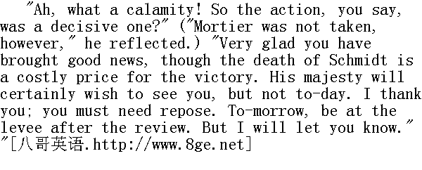 哎, 多么不幸啊!您说, 这是一场决定性的战役吗?但是莫蒂埃还没有被抓起来(他想了想。)。虽然施米特阵亡是为赢得胜利而付出的高昂代价, 但是我非常高兴, 您带来了好消息。陛下也许很想和您见面, 但是并不是今天。我感谢您, 去休息休息。明天阅兵后您来朝拜吧。最好还是我来通知您。" The stupid smile, which had disappeared while he was talking, reappeared on the war minister's face. 谈话时已经消失的愚蠢的微笑又在军政大臣脸上流露出来。 "Au revoir, I thank you indeed. His majesty the Emperor will most likely wish to see you," he repeated, and he bowed his head. " 再见, 我很感谢您。国王也许很想和您见面。"他重说一遍, 低下头去。 As Prince Andrey left the palace, he felt that all the interest and happiness that had been given him by this victory had been left behind by him now in the indifferent hands of the minister and the formal adjutant. The whole tenor of his thoughts had instantaneously changed. The battle figured in his mind as a remote, far-away memory. 当安德烈公爵从皇宫里走出来的时候, 他觉得, 胜利给他带来的一切利益和幸福现今已被他抛弃, 并且交给军政大臣和谦恭的副官的冷冰冰的手中了。他的全部思想转瞬之间改变了。他仿佛觉得这场战斗已是久远的往事的回忆。
