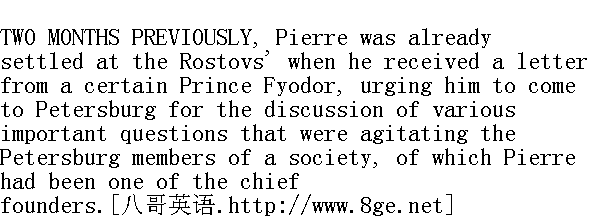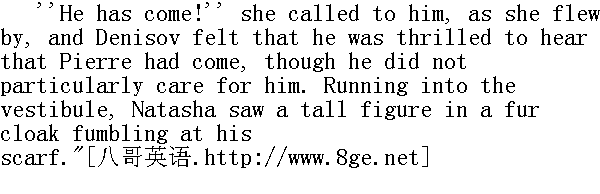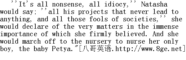 都是胡说, 都是废话, "娜塔莎说, "他的胡思乱想不会有什么结果, 那些协会都愚蠢透顶, "现在她对那些自己原来认为很重要的事下了这样的断语。随后她就到育儿室去喂她自己的唯一的儿子佩佳去了。 No one could give her such sensible and soothing consolation as that little three months' old creature, when it lay at her breast, and she felt the movement of its lips and the snuffling of its nose. That little creature said to her: ''You are angry, you are jealous, you would like to punish him, you are afraid, but here am I-I am he. Here, I am he ...'' And there was no answering that. It was more than true. 她抱起出生刚满三个月的小东西感到他的小嘴在翕动, 小鼻子在呼哧, 她从他身上获得的东西超过了任何人的启示和安慰。这个小东西仿佛在说: "你生气了, 你妒忌了, 你要向他算帐, 你又害怕了, 可我就是他, 我就是他......"她无言以对, 因为他说的是实话。 Natasha had so often during that fortnight had recourse to her baby for comfort, that she had over-nursed him, and he had fallen ill. She was terrified at his illness, but still this was just what she needed. In looking after him, she was able to bear her uneasiness about her husband better. 在这烦躁不安的两星期里娜塔莎常常跑到孩子那里去寻求安慰, 不断摆弄孩子, 结果奶喂多了, 把孩子也弄病了。孩子一病, 她惊慌失措, 但又希望孩子生病。因为孩子一病要照顾, 就会减轻对丈夫的牵挂。 She was nursing the baby when Pierre's carriage drove noisily up to the entrance, and the nurse, knowing how to please her mistress, came inaudibly but quickly to the door with a beaming face. 那天, 娜塔莎正在给孩子喂奶, 门口传来皮埃尔的雪橇声。保姆知道怎样来讨好女主人, 就欢喜得容光焕发, 悄悄地快步走进来。 ''He has come?'' asked Natasha in a rapid whisper, afraid to stir for fear of waking the baby, who was dropping asleep." 是他回来了吗?"娜塔莎连忙低声问, 身子不敢动弹, 唯恐吵醒刚睡着的孩子。