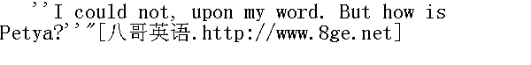 我实在没办法早回来, 真的!佩佳怎么样?" ''He is all right now, come along. Aren't you ashamed? If you could see what I am like without you, how wretched I am ...''" 现在没什么了, 我们走吧!你真不害臊!你该亲眼看看, 你不在时我遭的那个折磨啊! ''Are you quite well?''" 你身体好吗?" ''Come along, come along,'' she said, not letting go of his hand. And they went off to their rooms. When Nikolay and his wife came to look for Pierre, they found him in the nursery, with his baby son awake in his arms, and he was dandling him. There was a gleeful smile on the baby's broad face and open, toothless mouth. The storm had long blown over, and a bright, sunny radiance of joy flowed all over Natasha's face, as she gazed tenderly at her husband and son." 走吧, 走吧, "她说着, 没有放开他的手。他们一起到卧室去了。尼古拉夫妇来访皮埃尔时, 皮埃尔正在育儿室用他那大手抱着刚睡醒的儿子逗着玩。孩子咧着嘴, 没有长牙的宽脸上浮起愉快的微笑。一切暴风骤雨已经过去, 娜塔莎深情地望着丈夫和儿子, 脸上焕发出快乐明朗的光辉。 ''And did you have a good talk over everything with Prince Fyodor?'' Natasha was saying." 你跟费奥多尔公爵都谈妥了吗?"娜塔莎问。