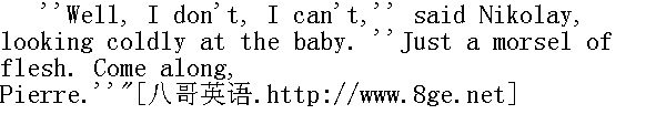 我不懂, 我看不出来, "尼古拉说, 冷冷地瞧着婴儿。"一块肉罢了, 走吧, 皮埃尔。" ''The great thing is, that he is really a devoted father,'' said Countess Marya, apologising for her husband, ''but only after a year or so ...''" 其实, 他还是个慈祥温存的父亲, "玛丽亚伯爵夫人替丈夫辩解说, "但要等孩子满一周岁......" ''Oh, Pierre is a capital nurse,'' said Natasha; ''he says his hand is just made for a baby's back. Just look.''" 皮埃尔可是很会带孩子, "娜塔莎说, "他说, 他的手生来就是为了抱孩子的。你们瞧。" ''Oh yes, but not for this,'' Pierre cried laughing, and hurriedly snatching up the baby, he handed him back to his nurse." 不, 可偏偏不是为了抱孩子。"皮埃尔忽然笑着说, 抱起孩子, 把他交给保姆。