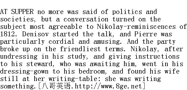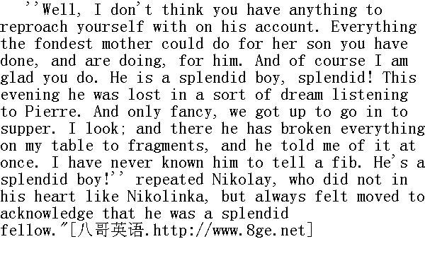 吃晚饭时, 大家不再谈论政治和社团, 话题一转, 大家回忆起一八一二年来, 这是尼古拉最喜欢的话题。杰尼索夫开的头, 皮埃尔谈到这话题也兴高采烈, 特别愉快。后来, 这几个亲戚在十分友好的气氛中散去。 晚饭过后, 尼古拉在书斋里宽衣, 对等候良久的管家交代了一些事情, 就换上睡衣, 走进卧室。此时, 他发现妻子还坐在写字台旁, 她正在写着什么东西。 ''What are you writing, Marie?'' asked Nikolay. Countess Marya flushed. She was afraid that what she was writing would not be understood and approved by her husband.She would have liked to conceal what she was writing from him, and at the same time, she was glad he had caught her, and she had to tell him." 你在写什么呀!玛丽?"尼古拉问, 玛丽亚伯爵夫人脸红了。她有些担心丈夫对她所写的东西能不能理解, 会不会赞成?她本来不想让他看她写的日记, 现在既然已被他发现, 那就顺水推舟, 让他知道这件事。这样一来, 她心中也觉得高兴和踏实。 ''It's my diary, Nikolay,'' she said, handing him a blue note-book, filled with her firm, bold handwriting." 这是日记, 尼古拉。"她把一本蓝色笔记本递给他看, 上面写满了笔迹刚健的字。 ''A diary!'' ... said Nikolay with a shade of mockery, and he took the note-book. He saw written in French:" 日记?......"尼古拉含着嘲讽的口气说, 接过日记本。日记是用法语写的。 ''December 4.-Andryusha'' (their elder boy) ''would not be dressed when he waked up this morning, and Mademoiselle Louise sent for me. He was naughty and obstinate. I tried threatening him, but he only got more ill-tempered. Then I undertook to manage him, left him, and helped nurse get the other children up, and told him I did not love him. For a long while he was quiet, as though he were surprised. Then he rushed out to me in his night-shirt, and sobbed so that I could not soothe him for a long while. It was clear that what distressed him most was having grieved me. Then, when I gave him his report in the evening, he cried piteously again as he kissed me. One can do anything with him by tenderness.''" 十二月四日, 今天大儿子安德留沙睡醒觉却不肯穿衣服, 路易小姐派人来找我。孩子既任性, 又十分固执。我想吓唬他一下, 不料, 他的火气更大了。我就来干我的事, 不理他了, 和保姆一起帮其他几个孩子穿衣服, 我对他说我不喜欢他。他似乎大为惊讶, 半天不吭一声。然后, 他穿上一件内衣跑到我跟前, 哇地一声大哭起来, 我费了好大劲也没法把他哄好。看得出来, 他因为伤了我的心而感到十分难过, 晚上, 我给他分数单时, 他吻着我, 又伤心地哭了。只要对他温存体贴, 他就能听话。"