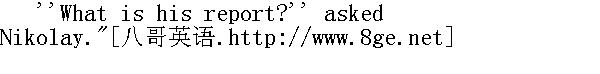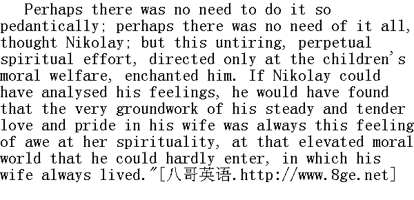 也许用不着这样过分认真, 也许完全不用这样做。"尼古拉想。但玛丽亚为培养孩子们的道德品质所作的孜孜不倦的努力和精神, 却使他钦佩之情, 油然而生。如果尼古拉能够充分理解自己的感情, 那么, 他会惊奇地发现他之所以如此坚贞、如此自豪和充满柔情地爱着妻子主要是因为她具有一个真诚的内心境界, 一个崇高的精神世界, 这是他几乎无法达到的, 这使他惊叹不已。 He was proud that she was so clever and so good, recognising his own insignificance beside her in the spiritual world, and he rejoiced the more that she, with her soul, not only belonged to him, but was a part of his very self. 他为妻子的聪明才智而感到骄傲, 他也意识到自己的精神世界与妻子相比, 是大为逊色的, 他更感到高兴的是, 她不仅身心属于他, 而且成了他的不可分割的一部分。 ''I quite, quite approve, my darling!'' he said, with a significant air. ''And,'' after a brief pause, he added, ''And I have behaved badly to-day. You were not in the study. Pierre and I were arguing, and I lost my temper. I couldn't help it. He is such a child. I don't know what would become of him if Natasha didn't keep him at her apron-strings. Can you imagine what he went to Petersburg about?...They have made a...''" 我完全赞成, 完全赞成, 亲爱的, "尼古拉意味深长的说。沉思片刻, 又补充说: "可我今天表现不好。当时你不在书斋。我在同皮埃尔争论时发了脾气。在那种情况下, 没法不发脾气, 他简直像个孩子。如果娜塔莎不把他管着, 我真不知道他会变成什么样子。你知道他去彼得堡干什么......他们在那里组织了......" ''Yes, I know,'' said Countess Marya. ''Natasha told me.''" 噢, 我知道, "玛丽亚伯爵夫人说。"娜塔莎告诉我了。" ''Oh, well, you know, then,'' Nikolay went on, getting hot at the mere recollection of the discussion. ''He wants to persuade me that it's the duty of every honest man to work against the government when one's sworn allegiance and duty....I am sorry you were not there. As it was, they all fell upon me, Denisov, and Natasha, too....Natasha is too amusing. We know she twists him round her little finger, but when it comes to discussion-she hasn't an idea to call her own-she simply repeats his words,'' added Nikolay, yielding to that irresistible impulse that tempts one to criticise one's nearest and dearest. Nikolay was unaware that what he was saying of Natasha might be said word for word of himself in relation to his wife." 那么说, 你已知道, "尼古拉一想起他们的争论就十分激动, 他接着说, "他想说服我相信, 一切正直人的职责就是去反对政府, 并且还要去宣誓效忠新的组织......可惜, 当时你不在场。要知道那时他们都把矛头对准了我, 包括杰尼索夫和娜塔莎......娜塔莎太可笑了。要知道平时她把皮埃尔管得很紧, 但是一开始争论, 她一点主见都没有了, 只是机械地重复着皮埃尔的话。"尼古拉补充说, 他已控制不住要议论议论自己的亲属了。他没想到他说娜塔莎的这番话, 可以原封不动地用到他对自己妻子的关系上。