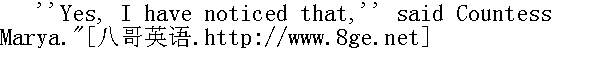 是的, 我也注意到了。"玛丽亚伯爵夫人说。 ''When I told him that duty and sworn allegiance come before everything, he began arguing God knows what. It was a pity you were not there. What would you have said?''" 当我对他说宣誓效忠、忠于职守高于一切, 他就乱说一通来证明自己见解的正确。真可惜, 当时你不在场, 要是你在场的话, 你会怎么说呢?" ''To my thinking, you were quite right. I told Natasha so. Pierre says that every one is suffering, and being ill-treated and corrupted, and that it's our duty to help our neighbours. Of course, he is right,'' said Countess Marya; ''but he forgets that we have other nearer duties, which God Himself has marked out for us, and that we may run risks for ourselves, but not for our children.''" 照我看, 你是完全正确的。我对娜塔莎也是这么说的, 皮埃尔说, 现在大家都在受苦受难, 腐化堕落, 我们有责任帮助他人。他的话当然也是对的, "玛丽亚伯爵夫人说, "但是他忘记了, 我们还有更迫切的责任, 这也是上帝给我们的指示, 那就是我们自己可以去冒险, 但决不能让孩子们也去冒险。" ''Yes, yes, that's just what I told him,'' cried Nikolay, who actually fancied he had said just that. ''And they had all their say out about loving one's neighbour, and Christianity, and all the rest of it, before Nikolinka, who had slipped in there, and was pulling all my things to pieces.''" 就是, 就是, 我对他就是这么说的, "尼古拉附和着说, 似乎他真的说过这样的话。"可他还是说要爱他人和基督教, 而且这些话都是当着小尼古拉的面说的, 这孩子偷偷地溜进书斋, 把东西都弄坏了。" ''Ah, do you know, Nikolay, I am so often worried about Nikolinka,'' said Countess Marya. ''He is such an exceptional boy. And I am afraid I neglect him for my own. All of us have our children; we all have our own ties; while he has nobody. He is always alone with his thoughts.''" 唉, 尼古拉, 你知道, 这孩子总是让我耽心, "玛丽亚伯爵夫人说。"他不是一个普通的孩子。我常怕由于自己的孩子而冷落了他。我们大家都有孩子, 都有亲人, 可是他什么亲人都没有。他老是一个人耽在那里想自己的心事。"