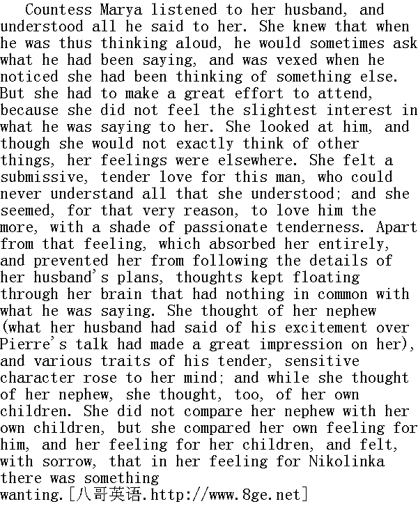 玛丽亚伯爵夫人一听就知道, 丈夫想对她说什么事了。她明白每当他自言自语时, 有时会突然问她, 他刚才说了什么, 如果他发觉, 她在想别的事, 他会生气的。她总是集中注意力去听他的讲话, 因为实际上她对他所讲话一点兴趣也没有。她眼睛望着他, 心中倒不是在想别的什么事, 而是在体会另一种感情。她对她面前这个人百依百顺, 怀着无限柔情, 而这个人对她所想的一切从来没有完全理解;尽管是这样, 她对他的一片深情还是越来越强烈, 并随时间的推移而越来越深。当她完全沉浸在这种感情中时对丈夫的各种想法和打算就根本听不进去, 不能深入细致地观察, 不仅如此, 她头脑里还不时闪过一些与丈夫的想法毫无共同之处的念头。她想到她的侄儿(丈夫说小尼古拉在听皮埃尔谈话时十分激动, 这使她大为吃惊), 想到他那多愁善感的性格。她想到侄儿, 也想到自己的孩子, 她并没有拿侄儿和她的孩子们来作比较, 但她比较了自己对他们的感情, 并发觉对小尼古拉的感情有所欠缺, 对此她深感内疚和不安。 Sometimes the idea had occurred to her that this difference was due to his age; but she felt guilty towards him, and in her soul vowed to amend, and to do the impossible, that is, in this life, to love her husband, and her children, and Nikolinka, and all her fellow-creatures, as Christ loved men. Countess Marya's soul was always striving towards the infinite, the eternal, and the perfect, and so she could never be at peace. A stern expression came into her face from that hidden, lofty suffering of the spirit, weighed down by the flesh. Nikolay gazed at her. ''My God! What will become of us, if she dies, as I dread, when she looks like that?'' he thought, and standing before the holy images, he began to repeat his evening prayer. 有时她想到, 这种区别是年龄的差异造成的;然而她又觉得自己有些地方对不起他。她内心暗自许诺要加以改正, 并做她不可能做到的事-就是要像耶稣基督爱全人类那样, 一辈子都爱丈夫, 爱孩子, 也爱小尼古拉, 爱一切人。玛丽亚伯爵夫人一直在不断地追求永生、永恒和尽善尽美的境界, 因而她的心灵永远得不到安宁。她脸上总是现出一种严肃的表情, 实际上反映出她那受肉体之累的灵魂所感受到的崇高而隐秘的痛苦。尼古拉向她看了一看。"天哪!当她脸上露出这种严肃的神色时, 我仿佛觉得她就要升天了。万一她去世了, 我们可怎么办?!"尼古拉心里这么想, 然后就站在圣像前做起晚祷来。