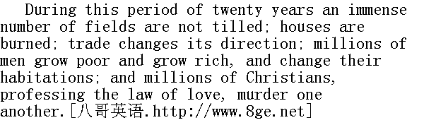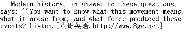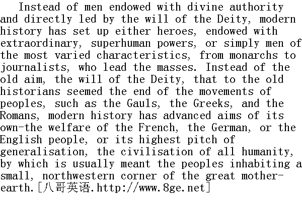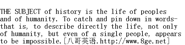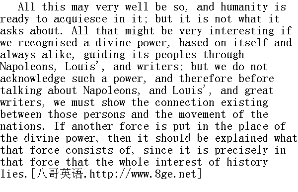 历史是一门研究各民族和人类生活的学科。然而, 人们却不能直接地去探索, 并通过语言文字详尽说明--不仅描述人类的生活, 而且尽述一个民族的生活, 也是不可能的。 All the ancient historians employed the same method for describing and catching what is seemingly elusive-that is, the life of a people. They described the career of individual persons ruling peoples; and their activity was to them an expression of the activity of the whole people. 以前的史学家们常常用一种简单的办法来描述和探索那种似乎难以捉摸的民族生活。他们总是阐释一个民族的统治者的生平活动;他们认为, 这种活动反映了整个民族的活动。 The questions, In what way individual persons made nations act in accordance with their will, and by what the will of those individuals themselves was controlled, the ancients answered, By the will of God; which in the first case made the nation subject to the will of one chosen person, and, in the second, guided the will of that chosen monarch to the ordained end. 至于少数个别人是怎样使各族人民按照他们的意志活动的呢?这些人自己的意志又受什么支配呢?对这些问题, 史学家是这样回答的: 史学家对第一个问题的回答是--承认神的意志, 使各民族服从一个各自选出的人的意志;对第二个问题的回答则是--还是承认那个神, 是他引导被选定的人的意志去达到指定的目标。 For the ancients these questions were solved by faith in the immediate participation of the Deity in the affairs of mankind. 如此这般, 上述问题就用信仰神直接干预人世间的事务的办法得到了解决。新的历史科学在理论上否定了这两条原则。 Modern history has theoretically rejected both those positions. One would have thought that rejecting the convictions of the ancients of men's subjection to the Deity, and of a defined goal to which nations are led, modern history should have studied, not the manifestations of power, but the causes that go to its formation. But modern history has not done that. While in theory rejecting the views of the ancients, it follows them in practice. 看来, 现代史学观既然否定了古人关于人类服从于神和他指引各民族奔向一个既定目标这种信仰, 那么, 它所研究的本不该再是政权的表面现象, 而应当是政权形成的原因了。但是, 并没有做到这一步。它在理论上虽否定了以前史学家的观点, 而在实践中却依然追随着他们。