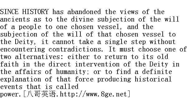 如果否定旧的观点, 即否定一个民族的意志服从一个由神选出来的人, 而那个人的意志又是服从神的, 那么历史就得从下列两件事中选择其一: 或者恢复神直接干预人类事务的旧信仰, 或者明确地阐明产生历史事件的、所谓权力的力量的涵义, 否则历史每走一步都要发生矛盾。 To return to the old way is out of the question: the old faith is shattered, and so an explanation must be found of the meaning of power. 回到第一种说法是不可能的, 因为旧信仰已经被破除了;所以必须说明权力的涵义。 Napoleon commanded an army to be raised, and to march out to war. This conception is so familiar to us, we are so accustomed to this idea that the question why six hundred thousand men go out to fight when Napoleon utters certain words seems meaningless to us. He had the power, and so the commands he gave were carried out. 拿破仑下令召集军队去作战。我们对这种看法是这么习以为常, 对这种看法是这么熟悉, 以致于为什么拿破仑一发出命令六十万人就去作战, 这样的问题就毫无意义了。他有权力, 所以就照他的命令办。 This answer is completely satisfactory if we believe that power has been given him from God. But as soon as we do not accept that, it is essential to define what this power is of one man over others. 假如我们相信权力是上帝赋予他的, 这个答案就令人十分满意了。但是我们若是不承认这一点, 那就得断定一个人统治别的人们的这种权力是什么。 This power cannot be that direct power of the physical ascendency of a strong creature over a weak one, that ascendency based on the application or the threat of the application of physical force-like the power of Hercules. Nor can it be based on the ascendency of moral force, as in the simplicity of their hearts several historians suppose, maintaining that the leading historical figures are heroes-that is, men endowed with a special force of soul and mind called genius. This power cannot be based on the ascendency of moral force; for, to say nothing of historical heroes, like Napoleon, concerning whose moral qualities opinions greatly differ, history proves to us that neither Louis XI. nor Metternich, who governed millions of men, had any marked characteristics of moral force, but that they were, on the contrary, in most respects morally weaker than any one of the millions of men they governed. 这种权力不可能是一个强者对一个弱者在体力上占有优势的那种直接的权力--运用体力或以体力相威胁的那种优势, 例如赫拉克勒斯①的权力;它也不可能建立在精神上的优势, 犹如一些历史家的幼稚的想法, 他们说, 历史上的大人物都是英雄, 即赋有特殊精神和智慧, 以及赋有所谓天才的人们。这种权力不可能建立在精神的优势上, 因为, 暂且不提拿破仑之流的英雄人物, 关于这类人物的道德品质的评价众说纷纭, 历史向我们表明, 统治千百万人的路易十一和梅特涅在精神上都没有任何特殊的优势, 相反, 他们多半在精神上比他们所统治的千百万人中的任何一人都差得多。 If the source of power lies not in the physical and not in the moral characteristics of the person possessing it, it is evident that the source of this power must be found outside the person-in those relations in which the person possessing the power stands to the masses. 假如权力的源泉既不在于拥有权力的人固有的体力, 也不在于他的道德品质, 那末很明显, 这种权力的源泉一定在人的身外, 在掌握权力的人同群众的关系中。 That is precisely how power is interpreted by the science of law, that cash bank of history, that undertakes to change the historical token money of power for sterling gold. 法学对权力的理解就是如此, 法学这个历史的货币兑换处, 允诺对权力的历史理解兑换成纯金。 Power is the combined wills of the masses, transferred by their expressed or tacit consent to the rulers chosen by the masses. 权力是群众意志的总和, 群众或以赞同的言语或以默许把意志交给他们所选出的统治者。 In the domain of the science of law, made up of arguments on how a state and power ought to be constructed, if it were possible to construct it, all this is very clear; but in its application to history this definition of power calls for elucidation. 在法学领域里, 在论述国家和政权应该妥善地建设(假如可以妥善地建设)时, 这一切都是十分明白的;不过, 在应用到历史上的时候, 这个权力的定义就需要加以说明了。