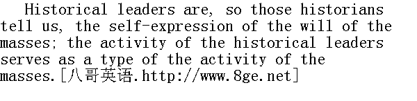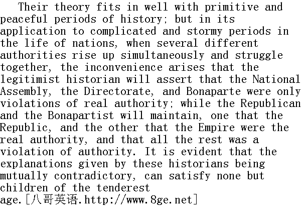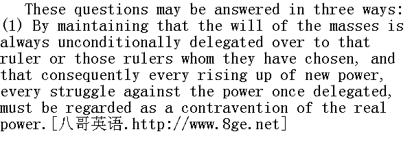 对这些问题可能有三种答案: 一、或者承认, 群众的意志总是无条件地移交给他们选定的统治者或统治者们, 因此, 任何新权力的出现, 任何反对既经移交的权力的斗争, 都应视为对真正权力的破坏行径。 Or (2) by maintaining that the will of the masses is delegated to the rulers, under certain definite conditions, and by showing that all restrictions on, conflicts with, and even abolition of power are due to non-observance of the rulers of those conditions upon which power was delegated to them. 二、或者承认, 群众的意志是在明确的众所周知的条件下移交给统治者们的, 并且指出, 对权力的种种限制、冲撞、以至摧毁, 都是由统治者们不恪守移交权力的条件造成的。 Or (3) by maintaining that the will of the masses is delegated to the rulers conditionally, but that the conditions are uncertain and undefined, and that the rising up of several authorities, and their conflict and fall, are due only to the more or less complete fulfilment of the rulers of the uncertain conditions upon which the will of the masses is transferred from one set of persons to another. 三、或者承认, 群众的意志是在不确定、不为人知的条件下移交给统治者的, 承认许多政权的兴亡, 它们之间的斗争, 是因为统治者或多或少满足了群众意志, 由一些人转给另一些人的不为人知的条件。 In these three ways do historians explain the relation of the masses to their rulers. 这就是史学家对群众与统治者的关系的三种解释。 Some historians-those most distinctively biographers and writers of memoirs, of whom we have spoken above-failing in the simplicity of their hearts to understand the question as to the meaning of power, seem to believe that the combined will of the masses is delegated to historical leaders unconditionally, and therefore, describing any such authority, these historians assume that that authority is the one absolute and real one, and that every other force, opposing that real authority, is not authority, but a violation of authority, and unlawful violence. 一些史学家, 就是上面提到的那些传记作者和专题史学家, 不了解权力的意义这个问题, 他们幼稚地认为, 似乎群众意志的总和是无条件地移交给历史人物的, 因此, 在记述某一种权力的时候, 这些史学家就把这种权力视为唯一的、绝对的、真正的权力, 任何反对这种权力的势力都不是权力, 而是对权力的一种侵犯、一种暴力。