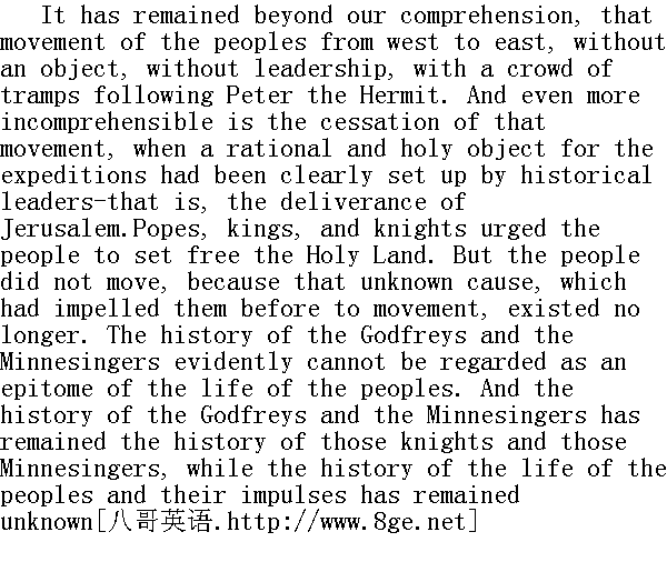 那场没有任何目的、没有领袖、只是一群乌合之众和一个隐士彼得⑤的自西而东的民族运动, 对我们来说, 依旧是不可理解的。在历史人物们已经明确地给十字军定下一个合理的、神圣的目标--解放耶路撒冷的时候, 而那次运动的中止尤其不可理解。教皇们、国王们和骑士们煽动人们去解放圣地;但是人们不去, 因为先前推动他们前去的那个未知道的原因已经不复存在了。哥弗雷和抒情歌手们⑥的历史显然不能包涵各民族的生活。哥弗雷和抒情歌手们的历史依旧是哥弗雷和抒情歌手们的历史, 而各民族的生活和他们的动机的历史依旧是未知的。 ⑤彼得是一名法国修道士, 禁欲主义者, 据传说, 第一次十字军东征是由他鼓动起来的。 ⑥抒情歌手出现于十二三世纪的德国, 他们到处唱情歌, 也唱十字军军歌。 Even less explanatory of the life of the peoples is the history of the lives of writers and reformers. 著作家和改革家的历史更少向我们说明各民族的生活。 The history of culture offers us as the impelling motives of the life of the people the circumstances of the lives or the ideas of a writer or a reformer. We learn that Luther had a hasty temper and uttered certain speeches; we learn that Rousseau was distrustful and wrote certain books; but we do not learn what made the nations cut each other to pieces after the Reformation, or why men guillotined each other during the French Revolution. 文化史向我们说明一个著作家或一个改革家的生活与思想动机和特点。我们知道, 路德脾气急躁, 说过如此这般的话;我们知道卢梭多疑, 写过如此这般的书;但是我们不知道, 宗教改革以后, 各民族为何互相屠杀, 也不知道, 法国革命时期, 人们为何彼此处以死刑。