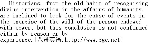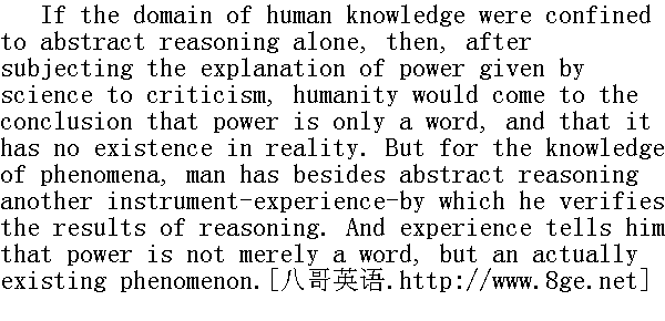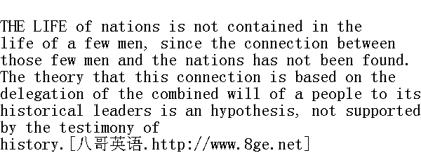 假如人类知识的领域只限于抽象的思维, 那么, 把科学对权力所作的解释加以批判后, 人类就可以得出这样的结论: 权力不过是一个词语, 实际是不存在的。但是, 为了认识现象, 人类除了抽象的思维, 还有一个用来检测思维结果的工具--经验, 而经验告诉我们, 权力不仅是一个词语, 而且是一个实际存在的现象。 To say nothing of the fact that not a single account of the combined action of men can omit the conception of power, the reality of power is shown us, not only by history, but by observation of contemporary events. 不待说, 没有权力的观念, 就无法叙述人们的集体活动, 而且权力的存在已经由历史和对当代事件的观察所证实。 Whenever an event takes place, a man or men appear by whose will the event is conceived to have been accomplished. Napoleon III. gives an order, and the French go to Mexico. The Prussian King and Bismarck give certain orders, and troops go to Bohemia. Napoleon I. gives a command, and soldiers march into Russia. Alexander I. gives a command, and the French submit to the Bourbons. Experience shows us that whatever takes place, it is always connected with the will of one or of several men, who decreed it should be so. 一桩事件发生了, 总有一个人或几个人出现, 那桩事件好像由于他或他们的意志发生的。拿破仑三世颁布一道命令, 于是法国人到墨西哥去了①。普鲁士国王和俾斯麦颁布一道命令, 于是一支军队进入了波西米亚②。拿破仑一世颁布一道命令, 于是一支军队进入了俄国。亚历山大一世颁布一道命令, 于是法国人服从了波旁王朝。经验告诉我们, 无论发生什么事件, 那桩事件总与颁布命令一个人或几个人的意志相联系。 ①一八六四年, 在法军支持下, 马克西米连取得了墨西哥王位。 ②指一八六六年奥、普战争。