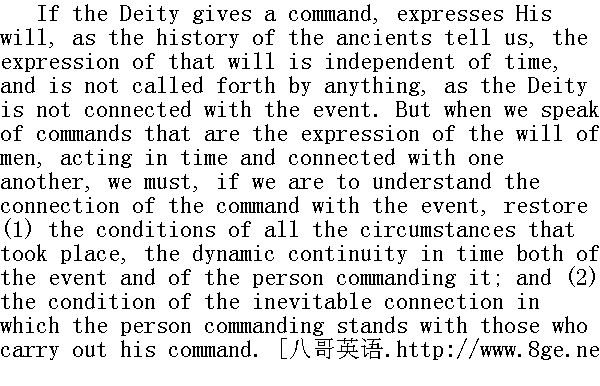 假如神发布一道命令, 表示自己的意志, 就像古代历史告诉我们那样, 那么, 这种意志的表示与时间无关, 也不由任何东西引起, 因为神与事件并无牵连。但是, 如果谈到命令--它是在一定时间行动的、彼此相关的人们的意志的表现, 为了说明命令和事件的关系, 就应当重新确定: 一、发生一切的条件: 事件和发布命令的人在一定时间内行动的连续性, 二、发布命令的人和那些执行他的命令的人之间的必然联系的条件。