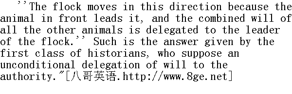 牲口所以朝那个方向走, 是因为那只在前面走的牲口引导着它, 所以别的牲口的意志总和都交给那群牲畜的头头。"这就是第一类历史学家--那些认为无条件移交权力的人--的回答。 ''If the animals leading the flock are changed for others, it is due to the fact that the combined will of all the beasts is transferred from one leader to another owing to the fact that the first leader did not follow the direction chosen by all the flock.'' Such is the reply of those historians who assume that the combined will of the masses is vested in their rulers on conditions which they regard as unknown. (With this method of observation it very often happens that the observer, judging from the direction chosen by him, reckons as leaders those who, when the direction of the masses is changed, are not in front, but on one side, and even sometimes the hindmost.)" 假如带领那群牲口的牲畜更换了, 那是因为那头牲口带领的方向不是一群牲口所选择的方向, 所有牲畜的意志的总和就由一个头头移交给另一个头头。"这就是那些认为群众意志的总和在他们认为已知的条件下移交给统治者的史学家的答案。(使用这种观察方法就常常发生以下的情形: 那个观察者按照他所选定的方向, 把那些由于群众改变方向, 不再走在前头、而走在一边、甚至有时把落在后面的人当作带头的人。) ''If the beasts that are foremost are constantly being changed, and the direction taken by the flock too is continually changing, that is due to the fact that to attain a certain direction known to us the beasts delegate their wills to those beasts which attract our attention, and to study the movements of the flock we ought to observe all the noticeable animals that are moving on all sides of the flock.'' So say the third class of historians, who accept all historical characters as the expression of their age from monarchs to journalists." 假如前头的牲口不断地更换, 一群牲口的方向不断地变换, 那是因为, 为要到达既定的方向, 牲口把它们的意志移交给我们注目的那些牲口, 因此, 为研究一群牲口的运动, 我们应当观察这群牲口周围走动的所有令人注目的牲口。"认为所有历史人物--从帝王到新闻记者--是他们时代的代表的第三类史学家就是这样说的。 The theory of the transference of the will of the masses to historical characters is only a paraphrase-only a restatement of the question in other words. 群众意志移交给历史人物的理论, 不过是一种代用语--不过是对那个问题换一种说法而已。 What is the cause of historical events? Power.What is Power? Power is the combined will of the masses vested in one person.On what conditions are the wills of the masses vested in one person? On condition of that person's expressing the will of all men. That is, power is power. That is, power is a word the meaning of which is beyond our comprehension. 历史事件的原因是什么呢?--是权力。权力是什么呢?权力是移交给一个人的意志的总和。群众意志是在什么条件下移交给一个人呢?--在那个人代表全体人民的意志的条件下。这就是说, 权力是权力, 即是说, 权力就是我们不解其含义的词语。