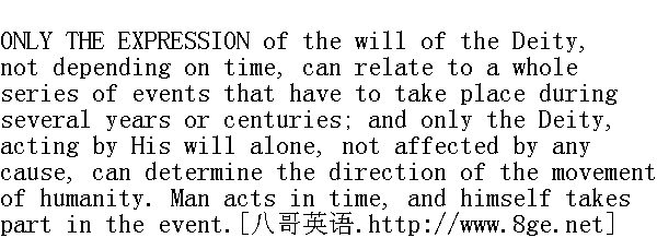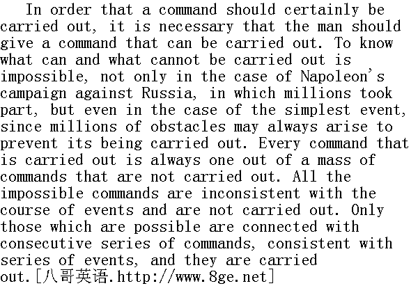 只有不以时间为转移的神的意志的表现, 才可以和若干年或若干世纪的一整串事件有关, 只有不受任何事物影响的神, 才可以由他自己的意志来确定人类行动的方向;但是人是按一定时间行动, 而且亲自参与事件的。 Restoring the first condition that was omitted, the condition of time, we perceive that no single command can be carried out apart from preceding commands that have made the execution of the last command possible. 只要重新确定第一个被忽略的条件--时间条件, 我们就可以看出, 没有使后一道命令可以执行的前一道命令, 则任何命令都是不可能执行的。 Never is a single command given quite independently and arbitrarily, nor does it cover a whole series of events. Every command is the sequel to some other; and it never relates to a whole course of events, but only to one moment in those events. 从来没有一道命令是自发地出现的, 也没有一道命令是适用于一连串事件的;而每道命令都是来自另一道命令, 从来不是针对一连串事件, 只是针对事件的某一时刻。 When we say, for instance, that Napoleon commanded the army to go to fight, we sum up in one single expression a series of consecutive commands, depending one upon another. Napoleon could not command a campaign against Russia, and never did command it. He commanded one day certain papers to be written to Vienna, to Berlin, and to Petersburg; next day certain decrees and instructions to the army, the fleet, and the commissariat, and so on and so on-millions of separate commands, making up a whole series of commands, corresponding to a series of events leading the French soldiers to Russia. 例如, 当我们说拿破仑命令军队去作战的时候, 我们是把一系列连续的、互相关联的命令结合在一道同时下达的命令中的。拿破仑不能下命令出征俄国, 也从来未曾下过那样的命令。他今天命令向维也纳、柏林、彼得堡发出这样那样的公文;明天又向陆军、舰队、兵站部发出这样那样的指示和命令, 等等, 等等--成百万条命令, 这许多命令形成一系列导致法国军队进入俄国一连串事件相应的命令。 Napoleon was giving commands all through his reign for an expedition to England. On no one of his undertakings did he waste so much time and so much effort, and yet not once during his reign was an attempt made to carry out his design. Yet he made an expedition against Russia, with which, according to his repeatedly expressed conviction, it was to his advantage to be in alliance; and this is due to the fact that his commands in the first case did not, and in the second did, correspond with the course of events. 拿破仑在位时, 曾发出远征英国的命令, 并且为此用了比用在任何别的计划上更多的力量和时间, 可是在他统治的全部时间内, 从来不曾有一次企图执行这个计划, 却侵入了他屡次认为宜于结成同盟的俄国, 其所以会发生这样的情形, 是因为前面那些命令对一连串事件不适宜, 而后面一些命令却是适宜的。