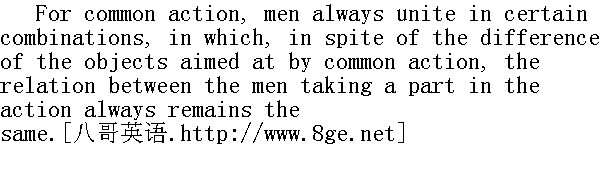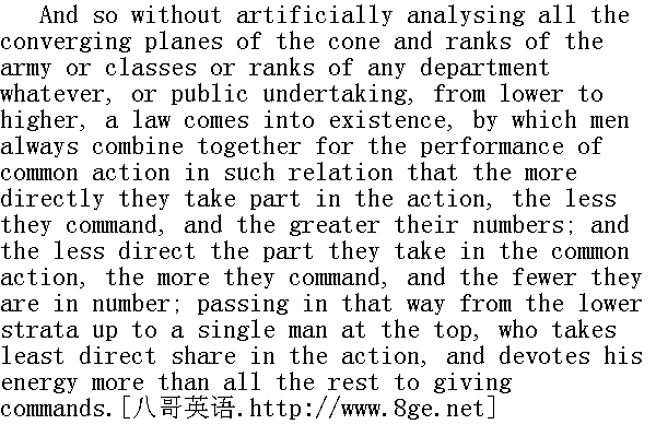 人们为共同行动而结成一定的团体, 在这些团体中, 尽管为共同行动所确立的目的不同, 但参与行动的人们之间的关系总是相同的。 Uniting in these combinations, men always stand in such a relation to one another that the largest number of men take a greater direct share, and a smaller number of men a less direct share in the combined action for which they are united. Of all such combinations in which men are organised for the performance of common action, one of the most striking and definite examples is the army. 人们结合成这些团体, 彼此之间总有这样的关系: 在他们结合起来采取集体行动时, 大多数的人是直接参与的, 少数人是间接参与的。在人们为集体行动而结成的团体中, 军队是最明确、最清楚的例子之一。 Every army is composed of members of lower military standing-the private soldiers, who are always the largest proportion of the whole, of members of a slightly higher military standing-corporals and non-commissioned officers, who are fewer in number than the privates; of still higher officers, whose numbers are even less; and so on, up to the chief military command of all, which is concentrated in one person. 每支军队都包括低级军事人员--列兵, 他们总占绝大多数;比较高的军事人员--班长和军士;他们的总数比列兵少;更高级的军官的总数目更少, 由此类推, 直到权力集于一人之身的最高军事首脑。 The military organisation may be with perfect accuracy compared to the figure of a cone, the base of which, with the largest diameter, consists of privates; the next higher and smaller plane, of the lower officers; and so on up to the apex of the cone, which will be the commander-in-chief. 军事组织酷似圆锥体, 直径最大的底部是由列兵组成的;比底部较高的截面, 是由较高级军事人员组成的;由此类推, 直到圆锥体的顶端就是总司令了。 The soldiers, who are the largest number, form the lowest plane and the base of the cone. The soldier himself does the stabbing and hacking, and burning and pillaging, and always receives commands to perform these acts from the persons in the plane next above. He himself never gives a command. The non-commissioned officer (these are fewer in number) more rarely performs the immediate act than the soldier; but he gives commands. The officer next above him still more rarely acts directly himself, and still more frequently commands. The general does nothing but command the army, and hardly ever makes use of a weapon. The commander-in-chief never takes direct part in the action itself, and simply makes general arrangements as to the movements of the masses. A similar relation exists in every combination of persons for common action-in agriculture, commerce, and in every department of activity. 人数最多的士兵组成圆锥体的底部和它的基础。士兵直接去刺、杀、烧、抢, 也总从高级人员接受从事这些行动的命令;他们自己从来不发布一道命令。那些军士们(为数较少)行动比士兵为少;但是他们发布命令。军官更少地直接行动, 但是命令发得更多了。将军只是指挥部队, 指示目标, 几乎从来不使用武器。总司令从来不直接参加战斗, 只是发布有关群众行动的总的命令。在人们从事共同行动的所有团体中--在农业、商业和一切行政机关中, 人与人之间的关系都是这样。