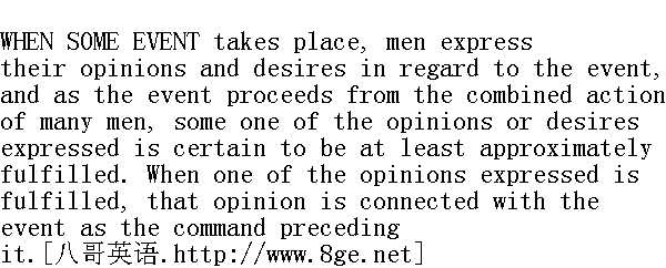 一桩事件发生时, 人们对那桩事件表示自己的意见和愿望, 因为事件是许多人的集体行动产生的, 这些表示出来的意见或愿望中必然有一个实现了, 或者差不多实现了。当其中一个意见得以实现的时候, 在我们的脑子里, 这个意见作为事先发出的命令与事件联系起来。 Men are dragging a log. Every man expresses his opinion as to how and where to drag it. The men drag the log off; and it turns out that it has been done just as one of them advised. He gave the command then. This is commanding and power in its primitive aspect. 许多人拖一根木头。每个人都发表意见: 怎样拖和往哪里拖。他们把木头拖走了, 事后表明, 这件事是照他们之中的一个人的话做的。他发了命令。这就是命令和权力的原始形态。 The man who did most work with his arms could think least what he was doing, reflect least what might come of the common action, and so command least. The man who commanded most could obviously, from his greater verbal activity, act less vigorously with his arms. In a larger assembly of men, combining their energies to one end, the class of those persons who take the less direct share in the common work the more their energy is turned to command, is still more sharply defined. 那个较多地用手干活的人, 就会较少地想他所做的事, 也不能考虑共同行动会导致什么结果, 不能发号施令。那个较多地从事指挥的人, 由于他是动嘴, 显然较少地动手了。当一个比较大的群体共赴一个目标的时候, 那些越少直接参加共同活动, 越多从事发号施令的人的等级就更分明了。 When a man acts alone, he always carries within him a certain series of considerations, that have, as he supposes, directed his past conduct, and that serve to justify to him his present action, and to lead him to make projects for his future activity. 一个人独立工作的时候, 他总有他认为指导他的过去行动、为他现在的行动辩护、指导他计划将来行动的一些想法。 Assemblies of men act in the same way, only leaving to those who do not take direct part in the action to invent considerations, justifications, and projects concerning their combined activity. 群体也是这样, 让那些不直接参与行动的人为他们的集体行动进行考虑、辩护和拟议。