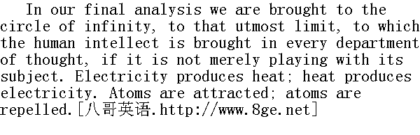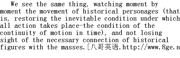 我们分析到最后, 就可以达到无限的循环, 达到人类智慧在一切思维领域内达到的极限, 假如智慧不对它所研究的对象采取玩弄的态度的话。电生热, 热生电。原子互相吸引, 原子互相排斥。 Speaking of the mutual relations of heat and of electricity and of atoms, we cannot say why it is so, and we say it is so because it is unthinkable otherwise; because it must be so; because it is a law. The same thing applies also to historical phenomena. Why does a war or a revolution come to pass? We do not know. We only know that to bring either result to pass, men form themselves into a certain combination in which all take part; and we say that this is so because it is unthinkable otherwise; because it is a law. 谈到热、电或原子的最简单的作用, 我们不能说为什么会发生这些作用, 我们说, 这些现象的自然属性就是这样, 这是他们的法则。历史事件也是一样。战争或革命为什么会发生?我们不知道;我们只知道, 为了进行某种行动, 人们组成一定的集体, 他们都参加了那个集体;我们说, 人的天性就是这样, 这是一种法则。