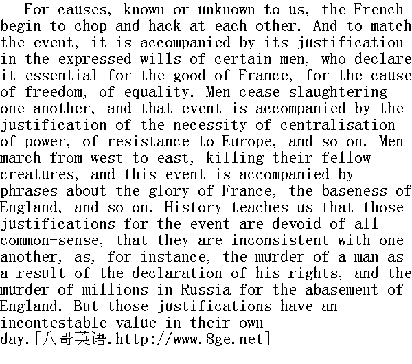 由于我们知道的或不知道的理由, 法国人开始互相淹死, 互相屠杀。于是与那个事件相应, 用人们的意志为那一事件辩解说: 其所以有此必要, 是为了法国的利益, 为了自由, 为了平等。人们停止互相残杀, 于是对这一事件加以辩解: 为了权力统一, 抵抗欧洲, 等等这是很有必要的。人们自西而东去残杀他们的同类, 伴随这一事件而来的是法国的光荣、英国的卑下等说法。历史告诉我们, 为这些事件所作的辩解没有任何共同的思想, 都是互相矛盾的、例如说杀人是由于承认他的权力, 在俄国杀掉成百万人是为了羞辱英国。但是这些辩解在当时却具有必要的意义。 They remove moral responsibility from those men who produce the events. At the time they do the work of brooms, that go in front to clear the rails for the train: they clear the path of men's moral responsibility. Apart from those justifications, no solution could be found for the most obvious question that occurs to one at once on examining any historical event; that is, How did millions of men come to combine to commit crimes, murders, wars, and so on? 这些辩解是为了消除那些制造事件的人们的道德责任。这些暂时的目的犹如清扫前面轨道的刷子, 也是为人们的道德责任清道的。没有这些辩解, 就无法回答在考察每一历史事件时所遇到的最简单的问题: 千百万人集体犯罪、打仗、杀人等等。 Under the existing complex forms of political social life in Europe, can any event be imagined which would not have been prescribed, decreed, commanded by some sovereigns, ministers, parliaments, or newspapers? Is there any sort of combined action which could not find justification in political unity, or in patriotism, or in the balance of power, or in civilisation? So that every event that occurs inevitably coincides with some expressed desire, and receiving justification, is regarded as the result of the will of one or more persons. 现时在欧洲的国务活动和社会生活的复杂形式下, 任何不由那些君主、大臣、国会, 或报纸发出指示和命令的事件是可以想象的吗?有什么集体行动不能从国家统一、爱国主义、欧洲均势, 或文明上找到辩解的呢?因此, 每次发生的事件必然符合某种愿望, 而且得到辩解, 表现为一个人或几个人的意志的产物。 Whichever way the ship steers its course, there will always be seen ahead of it the flow of the waves it cleaves. To the men in the ship the movement of those waves will be the only motion perceptible. 一艘船不论朝哪个方向驶行, 在它面前总可以看到被它所划开的波浪。对船上的人来说, 这些波浪的流动是唯一看得见的运动。 It is only by watching closely, moment by moment, the movement of that flow, and comparing it with the movement of the ship, that we are convinced that every moment that flowing by of the waves is due to the forward movement of the ship, and that we have been led into error by the fact that we are ourselves moving 只有每时每刻仔细观察那些波浪的运动, 并且把波浪的运动跟船的运动加以比较, 我们才会明白, 波浪每时每刻的运动都是由于船的运动引起的, 因为我们不觉得自己在运动, 所以产生了错觉。 too.