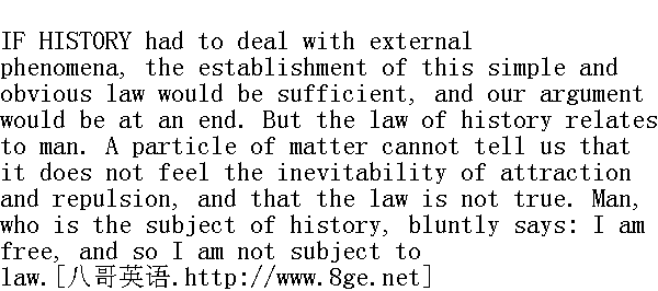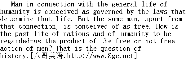 联系人类的全部生活来看, 人是服从那决定这种生活的法则的。但是, 不从这种联系来看, 一个人他似乎是自由的。应当怎样看待各民族和人类的过去生活呢--作为人们自由行动的产物呢, 还是作为人们不自由行动的产物呢?这是历史的问题。 Only in our conceited age of the popularisation of knowledge, thanks to the most powerful weapon of ignorance-the diffusion of printed matter-the question of the freedom of the will has been put on a level, on which it can no longer be the same question. In our day the majority of so-called advanced people-that is, a mob of ignoramuses-have accepted the result of the researches of natural science, which is occupied with one side only of the question, for the solution of the whole question. 只有在我们知识普及、具有自信的时代, 因为有对付愚昧的最有力的工具--印刷品的传播, 才把意志自由的问题提到这个问题本身不能存在的地位。在我们这个时代, 大多数所谓先进人物, 也就是一群不学无术的人, 从事博物学家的工作, 研究问题的一个方面, 以求得全部问题的解答。 There is no soul and no free will, because the life of man is expressed in muscular movements, and muscular movements are conditioned by nervous activity. There is no soul and no free will, because at some unknown period of time we came from apes, they say, and write, and print. Not at all suspecting that thousands of years ago all religions and all thinkers have admitted-have never, in fact, denied-that same law of necessity, which they are now so strenuously trying to prove by physiology and comparative zoology. They do not see that natural science can do no more in this question than serve to illumine one side of it. The fact that, from the point of view of observation, the reason and the will are but secretions of the brain, and that man, following the general law of development, may have developed from lower animals at some unknown period of time, only illustrates in a new aspect the truth, recognised thousands of years ago by all religious and philosophic theories, that man is subject to the laws of necessity. It does not advance one hair's-breadth the solution of the question, which has another opposite side, founded on the consciousness of freedom. 灵魂和自由不存在, 因为人的生活是筋肉运动的表现, 而筋肉运动受制于神经的活动;灵魂和自由意志并不存在, 因为在远古时代我们是由猿猴变来的, 他们就是这样说、写、印成书刊, 一点也不怀疑, 他们现在那么卖力用生理学和比较动物学来证明的那个必然性的法则, 早在几千年前, 不仅被所有宗教和所有思想家所承认, 而且从未被人否认。他们不知道, 在这个问题上, 自然科学只能解释问题一个方面。因为, 从观察的观点来看, 理性和意志不过是脑筋的分泌物(secretion), 根据一般的法则, 人可能是在那无人知道的时代从低级动物发展起来的, 这事实不过从一个新的方面说明了几千年前所有宗教和哲学理论都承认了的真理, 从理性的观点来看, 人从属于必然性的一系列法则, 但是它一点也没有促进这个问题的解决, 这个问题具有建立在自由意识上的相反的另一方面。 If men have descended from apes at an unknown period of time, that is as comprehensible as that they were fabricated out of a clod of earth at a known period of time (in the one case the date is the unknown quantity, in the other the method of fabrication); and the question how to reconcile man's consciousness of free will with the law of necessity to which he is subject cannot be solved by physiology and zoology, seeing that in the frog, the rabbit, and the monkey we can observe only muscular and nervous activity, while in man we find muscular and nervous activity plus consciousness. 假如人是在无人知道的时代从猿猴变来的, 这与说他是在某个时期用一把土做成的, 是同样可以理解的(前者的未知数是时间, 后者的未知数是起源), 而人的自由意识怎样与他所服从的必然性法则相结合的问题, 是不能用比较生理学和动物学来解决的, 因为从青蛙、兔子和猿猴身上, 我们只能观察到肌肉和神经活动, 但是从人身上, 我们既能观察到肌肉活动和神经活动, 也能观察到意识。 The scientific men and their disciples who suppose they are solving this question are like plasterers set to plaster one side of a church wall, who, in the absence of the chief superintendent of their work, should in the excess of their zeal plaster over the windows, and the holy images, and the woodwork, and the scaffolding, and rejoice that from the plasterers' point of view everything was now so smooth and even. 那些自以为能解决这个问题的博物学家和他们的信徒, 正如这样一些灰泥匠: 本来指定他们粉刷教堂的一面墙壁, 可是他们趁着总监工不在, 一时热情冲动, 粉刷了窗子、神像、脚手架, 还未加扶壁的墙壁, 他们心里很高兴, 从他们作灰泥匠的观点来看, 一切都弄得又平又光滑。
