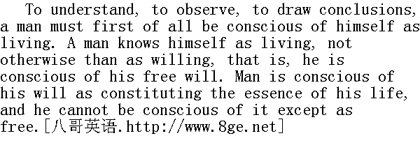 要想理解、观察和推理, 人首先必须意识到自己是活着的。一个人有了意愿, 也就是意识到他的意志, 他才知道自己是活着的。但是, 当人意识到构成他的生命实质的意志时, 他也只能意识到它是自由的。 If subjecting himself to his own observation, a man perceives that his will is always controlled by the same law (whether he observes the necessity of taking food, or of exercising his brain, or anything else), he cannot regard this never-varying direction of his will otherwise than as a limitation of it. If it were not free, it could not be limited. A man's will seems to him to be limited just because he is not conscious of it except as free. You say: I am not free. But I have lifted and dropped my hand. Everybody understands that this illogical reply is an irrefutable proof of freedom. 假如人在观察自己的时候, 他看出他的意志总是按同一法则活动(他观察吃饭的必要性或者头脑的活动, 或者观察任何别的现象), 他不能不把他的意志总是沿着同样的方向活动看作意志的限制, 如无自由, 则无限制可言。一个人觉得他的意志受限制, 正因为他意识到他的意志是自由的。你说: 我是不自由的。但是我举起我的手, 又把它放下。人人都懂得, 这一不合逻辑的答案是一种无法反驳的自由的证明。 This reply is an expression of a consciousness not subject to reason. 这个答案不属于理性的意识的表现的范畴。 If the consciousness of freedom were not a separate source of self-knowledge apart from reason, it would be controlled by reasoning and experience. But in reality such control never exists, and is inconceivable. 假如自由的意识不是一个独立的不依赖理性的自我认识的源泉, 那么, 它就是可以论证和实验的, 但实际并不存在这种情况, 而且是不可思议的。 A series of experiments and arguments prove to every man that he, as an object of observation, is subject to certain laws, and the man submits to them, and never, after they have once been pointed out to him, controverts the law of gravity or of impenetrability. But the same series of experiments and arguments proves to him that the complete freedom of which he is conscious in himself is impossible; that every action of his depends on his organisation, on his character, and the motives acting on him. But man never submits to the deductions of these experiments and arguments. 一系列的实验和论证对每个人表明, 他, 作为观察的对象, 服从某一些法则;人一旦认识到万有引力不渗透性的法则, 他就服从这些法则, 并且永远不会抗拒这些法则。但是, 一系列同样的实验和论证对他表明, 他内心感觉的那种完全的自由是不可能存在的, 他的每一个动作都取决于他的肌体, 他的性格, 以及影响他的动机;但是人类从来不服从这些实验和论证的结论。