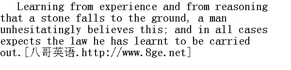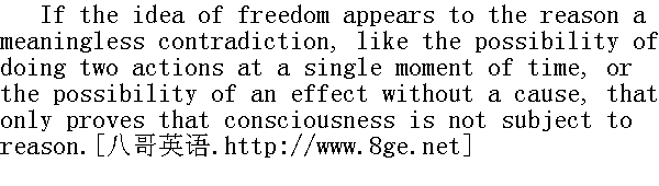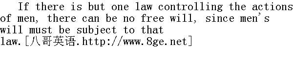 假如理性认为自由的概念是一种没有意义的矛盾, 好像在同一条件下做出两种不同动作的可能性一样, 或者好像一种没有理由的行动的可能性一样, 那只能证明意识不属于理性范畴。 That unwavering, irrefutable consciousness of freedom, not influenced by experience and argument, recognised by all thinkers, and felt by all men without exception, that consciousness without which no conception of man is reliable, constitutes the other side of the question. 这种不可动摇、不可否认的自由意识, 不受实验或论证支配, 为所有思想家所承认, 毫不例外地为每个人所觉察, 没有它就不可能有任何关于人的观念的自由的意识, 这构成问题的另一面。 Man is the creation of an Almighty, All-good, and All-wise God. What is sin, the conception of which follows from man's consciousness of freedom? That is the question of theology. 人是全能、全善、全知的上帝的造物。由人类的自由的意识中产生的罪恶是什么呢?这是神学的问题。 Men's actions are subject to general and invariable laws, expressed in statistics. What is man's responsibility to society, the conception of which follows from his consciousness of freedom? That is the question of jurisprudence. 人的行动属于用统计学表示的普遍的不变法则这一范畴。人类对社会的责任(这一概念也是从自由的意识中产生的)是什么呢?这是法学的问题。 A man's actions follow from his innate character and the motives acting on him. What is conscience and the sense of right and wrong in action that follows from the consciousness of freedom? That is the question of ethics. 人的行动是从他的先天性格和影响他的动机中产生的。良心是什么, 从自由的意识中产生出来的行为的善恶认识是什么?这是伦理学的问题。