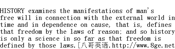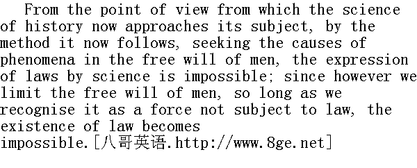 历史从时间和因果关系来考察人的自由意志与外部世界相联系的表现。也就是用理性的法则来说明这种自由, 因此, 历史只有用这些法则来说明自由意志时才是一门科学。 To history the recognition of the free wills of men as forces able to influence historical events, that is, not subject to laws, is the same as would be to astronomy the recognition of free will in the movements of the heavenly bodies. 就历史来说, 承认人的自由是一种能够影响历史事件的力量, 也就是一种不服从法则的东西, 正如对天文学来说, 承认天体运动是一种自由的力量一样。 This recognition destroys the possibility of the existence of laws, that is, of any science whatever. If there is so much as one body moving at its free will, the laws of Kepler and of Newton are annulled, and every conception of the movement of the heavenly bodies is destroyed. If there is a single human action due to free will, no historical law exists, and no conception of historical events can be formed. 承认这一点, 就取消了法则存在的可能性, 也就是取消了任何知识存在的可能性。如果有一个天体自由运行, 那么凯普勒和牛顿的定律就不再存在了, 任何天体运行的观念也不再存在了。如果有一种人的自由行动, 那么, 任何历史法则, 任何历史事件的观念, 都不存在了。 For history there exist lines of movement of human wills, one extremity of which vanishes in the unknowable, and at the other extremity of which in space, in time, and in dependence on cause, there moves men's consciousness of free will in the present. 对历史来说, 人的意志有若干运动路线, 其一端隐没在未知世界中, 但是在其另一端, 一种现今的人的意志在空间、时间和因果关系中活动着。 The more this curve of movement is analysed before our eyes, the clearer are the laws of its movement. To discover and define those laws is the problem of history. 这个活动范围在我们眼前展开得愈广, 这种活动的法则就愈明显。发现和说明那些法则乃是历史的任务。