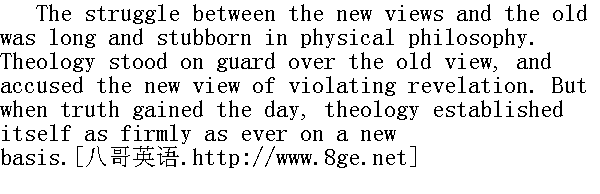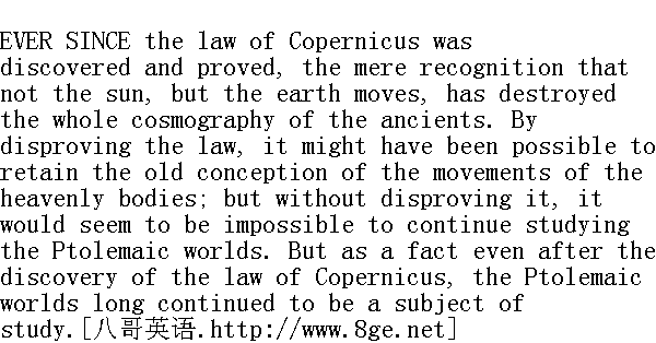 自从哥白尼体系被发现和证实以后, 仅仅承认太阳不会运转, 而是地球运转这一事实, 就足以破除古人的全部宇宙观了。反驳了这个体系, 就可以保持天体运行的旧观念, 但是不推翻它, 似乎不可能继续研究托勒美①的天动说。但是, 就在哥白尼体系被发现以后, 托勒美的天动说还被研究了很长时间。 ①托勒美是古希腊学者、天文学家和地理学家, 创立天动说。 Ever since the first person said and proved that the number of births or crimes is subject to mathematical laws, that certain geographical and politico-economical laws determine this or that form of government, that certain relations of the population to the soil lead to migrations of peoples-from that moment the foundations on which history was built were destroyed in their essence. 自从有人宣布和证明, 出生率和犯罪率服从数学法则, 一定的地理条件、政治和经济条件决定这种或那种管理形式, 人口和土地的一定关系造成民族迁徙--从此, 历史赖以建立的基础实际上被摧毁了。 By disproving those new laws, the old view of history might have been retained. But without disproving them, it would seem impossible to continue studying historical events, merely as the arbitrary product of the free will of individual men. For if a certain type of government is established, or a certain movement of peoples takes place in consequence of certain geographical, ethnographical, or economic conditions, the free will of those persons who are described to us as setting up that type of government or leading that movement cannot be regarded as the cause. 推翻了这些新法则, 就可以保持旧的历史观;但是, 不推翻它们, 似乎就不能研究作为人们自由意志产物的历史事件。因为, 假若由于某种地理条件、人种或经济条件而建立某种管理形式, 或发动某一民族迁徙, 那么, 在我们看来那些认为建立管理形式或发动民族迁徙的人的自由意志就不能被视为原因。 And yet history goes on being studied as of old, side by side with laws of statistics, of geography, of political economy, of comparative philology and geology, that flatly contradict its assumptions. 同时, 以前的历史与完全违反它的原理的统计学、地理学、政治经济学、比较语言学和地质学的法则继续被人研究着。