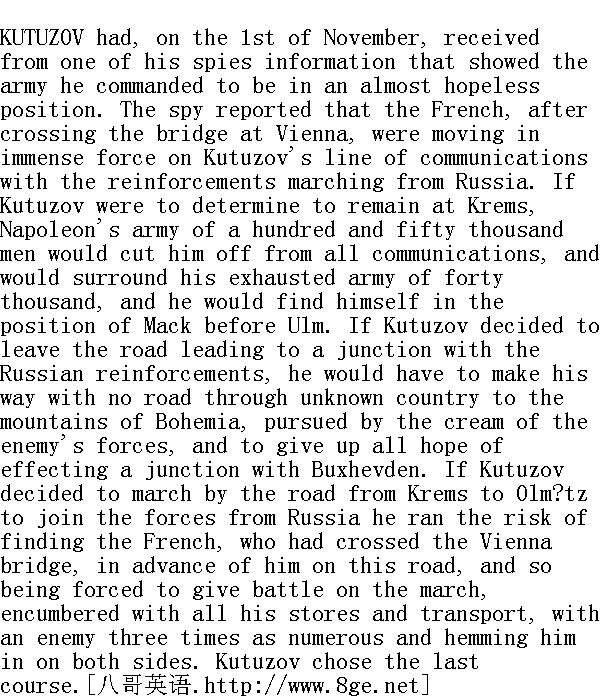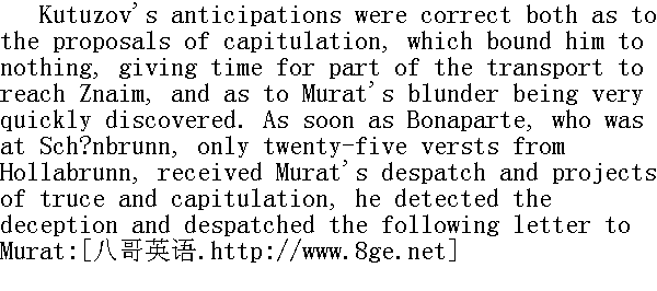 十一月一日, 库图佐夫从他的侦察兵那里得到了消息, 这项消息可能使他率领的军队陷入走投无路的境地。侦察兵禀告: 法国佬以其雄厚的兵力已越过维也纳大桥, 向库图佐夫和俄国开来的军队的交通线挺进。如若库图佐夫下定决心留守克雷姆, 拿破仑的十五万军队就要截断他的各条交通线, 包围他的精疲力竭的四万军队, 他就会处于乌尔姆战役中马克陷入的绝境。若是库图佐夫下定决心放弃他和俄国军队取得联络的道路, 他就会无路可走, 只得进入那人地生疏的无名的波希米亚山区, 自我防卫, 以免遭受拥有优势兵力的敌人的进犯, 并且丧失他和布克斯格夫登取得联络的任何希望。若是库图佐夫下定决心沿途退却, 从克雷姆斯撤退到奥尔米茨, 同俄国军队汇合, 那末在这条路上, 那些越过维也纳大桥的法国人就要抢先一步, 使库图佐夫遭受危险, 这样一来, 他就要被迫携带各种重型装备和辎重在行军中作战, 同兵力优越二倍、从两面向他夹攻的敌人作战。 库图佐夫选择了后一条出路。 The French, after crossing the river, had, as the spy reported, set off at a quick march toward Znaim, which lay on Kutuzov's line of routes more than a hundred versts in front of him. To reach Znaim before the French offered the best hopes of saving the army. To allow the French to get to Znaim before him would mean exposing the whole army to a disgrace like that of the Austrians at Ulm, or to complete destruction. But to arrive there before the French with the whole army was impossible. The road of the French army from Vienna to Znaim was shorter and better than the Russians' road from Krems to Znaim. 侦察兵禀告, 法国人越过维也纳大桥, 正以强行军的速度向库图佐夫撤退的道路上的茨奈姆推进, 在库图佐夫前头走了一百多俄里。先于法国官兵抵达茨奈姆, 意味着拯救全军的希望更大;让法国官兵抢先到达茨奈姆, 就意味着一定会使全军遭受乌尔姆战役之类的奇耻大辱, 或者使全军覆没。但是, 率领全军赶到法国官兵前头去是不可能的。法国官兵从维也纳到茨奈姆的道路, 比俄国官兵从克雷姆斯到茨奈姆的道路更短, 更便于行走。 On the night of receiving the news Kutuzov sent Bagration's advance guard of four thousand soldiers to the right over the mountains from the Krems-Znaim road to the Vienna and Znaim road. Bagration was to make a forced march, to halt facing towards Vienna and with his back to Znaim, and if he succeeded in getting on the road in advance of the French, he was to delay them as long as he could. Kutuzov himself with all the transport was making straight for Znaim. 得到消息的晚上, 库图佐夫派遣巴格拉季翁的四千人马的前卫队伍从克雷姆斯--茨索姆大道右侧翻越山峰向维也纳--茨奈姆大道推进。巴格拉季翁应当不停地走完这段行程, 在面朝维也纳背向茨奈姆的地方扎下营盘。假如能赶到法国官兵前头, 他就应当尽可能地阻止他们前进, 库图佐夫本人携带各种重型装备起程前赴茨奈姆。 Bagration marched forty-five versts, by night in stormy weather, through the mountains, with no road, and with hungry, barefoot soldiers. Leaving a third of his men straggling behind him, Bagration reached Hollabrunn, on the Vienna and Znaim road, a few hours before the French, who marched upon Hollabrunn from Vienna. Kutuzov needed fully another twenty-four hours to get to Znaim with all the transport, and so to save the army Bagration would have had, with his four thousand hungry and exhausted soldiers, to have kept at bay the whole army of the enemy confronting him at Hollabrunn for four-and-twenty hours, and this was obviously impossible. But a freak of fate made the impossible possible. The success of the trick that had given the Vienna bridge into the hands of the French encouraged Murat to try and take in Kutuzov too. Murat, on meeting Bagration's weak detachment on the Znaim road, supposed it to be the whole army of Kutuzov. To give this army a final and crushing defeat he waited for the troops still on the road from Vienna, and to that end he proposed a truce for three days, on the condition that neither army should change its position nor stir from where it was. Murat averred that negotiations for peace were now proceeding, and that he proposed a truce therefore to avoid useless bloodshed. The Austrian general, Nostits, who was in charge of the advance posts, believed the statements of Murat's messengers and retired, leaving Bagration's detachment unprotected. The other messengers rode off to the Russian line to make the same announcement about peace negotiations, and to propose a truce of three days, to the Russian troops. Bagration replied that he was not authorised to accept or to decline a truce, and sent his adjutant to Kutuzov with a report of the proposition made to him. 在暴风雨之夜, 巴格拉季翁带着那些忍饥挨饿、不穿皮靴的士兵在无路径的山中走了四十五俄里, 失去了三分之一的掉队的官兵。巴格拉季翁比法国官兵早几个钟头到达维也纳--茨奈姆大道上的霍拉布伦, 这时法国官兵正向霍拉布伦附近推进。库图佐夫随带辎重还要再走一昼夜才能抵达茨奈姆;因此, 为拯救军队巴格拉季翁就必须带领四千名饥饿而劳累的士兵花费一昼夜在霍拉布伦阻击相遇的全部敌军, 这显然是办不到的事。但是奇特的命运却使办不到的事变成办得到的事。不战而将维也纳大桥交到法国官兵手中这一骗术的成功促使缪拉也试图欺骗一下库图佐夫。缪拉在茨奈姆大道上遇见巴格拉季翁的兵力薄弱的部队后, 以为这就是库图佐夫的全军人马。为坚持粉碎这支部队, 他要等候从维也纳动身后于途中