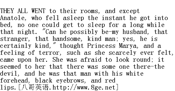 大家都四散了, 除开阿纳托利一上床就立刻睡着而外, 这一夜没有谁不是很久才入睡的。 "难道他--这个陌生、貌美而又慈善的男人就是我的丈夫吗?主要的是, 他很慈善, "公爵小姐玛丽亚想道, 一种她几乎从未感觉到的恐惧把她控制住了。她害怕向四面打量, 她仿佛觉得有人站帏围屏后面昏暗的角落。而这个人就是他--魔鬼, 而他就是这个额头雪白、眉毛乌黑、嘴唇绯红的男人。 She rang for her maid and asked her to sleep in her room. 她按铃把侍女喊来, 要侍女在她房里睡觉。 Mademoiselle Bourienne walked up and down the winter garden for a long while that evening, in vain expectation of some one; at one moment she was smiling at that some one, the next, moved to tears by an imaginary reference to ma pauvre mere reproaching her for her fall. 这天夜里布里安小姐在花房里来回地踱了很久, 徒然地等待某人, 她时而面对某人微笑, 时而竟被想象中的pauvremere(可怜的母亲)责备她堕落的话语感动得双眼流泪。 The little princess kept grumbling to her maid that her bed had not been properly made. She could not lie on her side nor on her face. She felt uncomfortable and ill at ease in every position. Her burden oppressed her, oppressed her more than ever that night, because Anatole's presence had carried her vividly back to another time when it was not so, and she had been light and gay. She sat in a low chair in her nightcap and dressing-jacket. Katya, sleepy and dishevelled, for the third time beat and turned the heavy feather bed, murmuring something. 矮小的公爵夫人对着侍女说埋怨话, 埋怨她没有把床铺好, 她觉得侧卧不行, 仰卧也不行, 睡起来总是难受, 很不自在。她的怀孕的肚子妨碍她了。现在比任何时候更加碍事, 阿纳托利在她面前, 使她更为生动地回想起往日的韶光, 当时她身未怀胎, 觉得什么都轻松愉快。她穿着一件短上衣, 戴着一顶睡帽, 坐在安乐椅上。卡佳的辫发散乱, 睡意正浓, 一面嘟哝着, 一面第三次抖松和翻转沉重的绒毛褥子。 "I told you it was all in lumps and hollows," the little princess repeated; "I should be glad enough to go to sleep, so it's not my fault."" 我跟你说过, 到处都是凹凸不平的, "矮小的公爵夫人反复地说, "我倒高高兴兴地睡着哩, 可见不是我的过失。"
