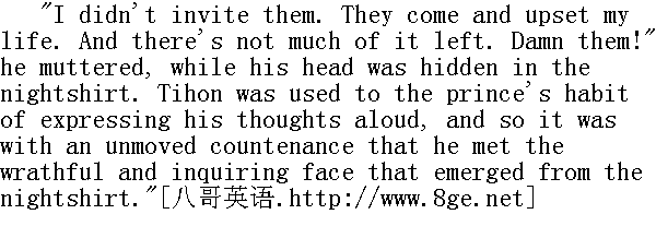 她像个想哭的儿童似的, 嗓音颤抖起来了。 The old prince too could not sleep. Tihon, half asleep, heard him pacing angrily up and down and blowing his nose. The old prince felt as though he had been insulted through his daughter. The insult was the more bitter because it concerned not himself, but another, his daughter, whom he loved more than himself. He said to himself that he would think the whole matter over thoroughly and decide what was right and what must be done, but instead of doing so, he only worked up his irritation more and more. 老公爵也没有睡觉。吉洪在睡梦中听见他很愤怒地踱着方步, 发出鼻嗤声。老公爵觉得他为女儿蒙受屈辱。这是最大的屈辱, 因为蒙受屈辱的不是他自己, 而是别人, 是他疼爱得甚于他自己的女儿。他对自己说, 他要反复思量这整个问题, 如发现它是正确的, 就应该处理, 可是他没有这样做, 他只是使他自己更加忿怒而已。 "The first stray comer that appears! and father and all forgotten, and she runs upstairs, and does up her hair, and rigs herself out, and doesn't know what she's doing! She's glad to abandon her father! And she knew I should notice it. Fr...fr...fr...And don't I see the fool has no eyes but for Bourienne (must get rid of her). And how can she have so little pride, as not to see it? If not for her own sake, if she has no pride, at least for mine. I must show her that the blockhead doesn't give her a thought, and only looks at Bourienne. She has no pride, but I'll make her see it..."" 只要遇见头一个男人, 就把父亲, 把一切忘得干干净净, 她跑着, 梳好头发, 摇动尾巴, 不成样子了!抛弃父亲才高兴啦!她明明知道, 我会看得出来的。呸......呸......呸......我难道看不见, 这个笨蛋只是盯着布里安(应当把她撵走)!缺乏自尊感, 哪能明白这一点!既然没有自尊感, 顾不着自己也罢, 至少也要顾全我的人格。应当给她讲明白, 这个笨蛋没有去想她, 只是盯着布里安。她没有自尊感, 可我要给她讲明这一点......" By telling his daughter that she was making a mistake, that Anatole was getting up a flirtation with Mademoiselle Bourienne, the old prince knew that he would wound her self-respect, and so his object (not to be parted from his daughter) would be gained, and so at this reflection he grew calmer. He called Tihon and began undressing. 老公爵告诉女儿, 说她正误入歧途, 阿纳托利存心追求布里安, 老公爵知道, 他将会损害公爵小姐玛丽亚的自尊心, 他的事儿(不愿离开他女儿)也就能办成, 因此他就安下心来。他喊了一声吉洪, 开始脱衣裳。 "The devil brought them here!" he thought, as Tihon slipped his nightshirt over his dried-up old body and his chest covered with grey hair." 鬼让他们到这里来!"当吉洪给他这个干瘦的胸前长满斑白汗毛的老头身上披起一件睡衣的时候, 他心中想道。