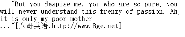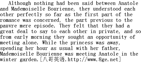没有什么可说的!他由他们吩咐, 他不仅可以娶你为妻, 也可以娶他想娶的任何人为妻, 而你有选择对象的自由......你回到自己房间里去, 慎重地考虑考虑, 一小时之后到我这里来, 当他的面说给他听: 嫁还是不嫁。我知道你将要祈祷, 好吧, 你就祈祷吧。只不过要好好考虑。你去吧。" "Yes or no, yes or no, yes or no!" he shouted again as the princess went out of the room, reeling in a sort of fog. Her fate was decided, and decided for happiness. But what her father had said about Mademoiselle Bourienne, that hint was horrible. It was not true, of course, but still it was horrible; she could not help thinking of it. She walked straight forward through the winter garden, seeing and hearing nothing, when all of a sudden she was roused by the familiar voice of Mademoiselle Bourienne. She lifted her eyes, and only two paces before her she saw Anatole with his arms round the Frenchwoman, whispering something to her. With a terrible expression on his handsome face, Anatole looked round at Princess Marya, and did not for the first second let go the waist of Mademoiselle Bourienne, who had not seen her." 嫁还是不嫁, 嫁还是不嫁, 嫁还是不嫁!"公爵小姐俨如置身迷雾之中, 摇摇晃晃地走出了书斋, 这时他还在大声喊着。她的命运已经决定了, 而且是福星高照。但是关于布里安小姐, 父亲说了一席话, 这是令人生畏的暗示。假定说, 这不是实话, 但毕竟令人生畏, 她不能不想这件事。她穿过温室迳直地向前走去, 什么也望不见, 什么也听不见, 可是骤然间, 她所熟悉的布里安小姐的耳语声把她惊醒了。她抬起眼睛, 在离自己身边两步路远的地方望见了阿纳托利, 他正在拥抱那个法国女郎, 对她轻声说了些什么。阿纳托利的清秀的脸上流露着可怖的神态, 他回头望望公爵小姐玛丽亚, 那一瞬间他没有松开搂抱布里安小姐腰部的手, 她没有望见公爵小姐玛丽亚。 "Who's there? What do you want? Wait a little!" was what Anatole's face expressed. Princess Marya gazed blankly at them. She could not believe her eyes. At last Mademoiselle Bourienne shrieked and ran away. With a gay smile Anatole bowed to Princess Marya, as though inviting her to share his amusement at this strange incident, and with a shrug of his shoulders he went to the door that led to his apartment." 谁在这儿?为什么?请您等一下!"阿纳托利那张脸仿佛在说话。公爵小姐玛丽亚沉默地望着他们。她不能明白这一点。布里安小姐终于惊叫一声, 跑开了。阿纳托利愉快地微笑, 向公爵小姐玛丽亚行个鞠躬礼, 仿佛要请她嘲笑这件怪事似的, 他耸了耸肩, 便向通往他的卧室的门口走去。 An hour later Tihon came to summon Princess Marya to the old prince, and added that Prince Vassily was with him. When Tihon came to her, Princess Marya was sitting on the sofa in her own room holding in her arms the weeping Mademoiselle Bourienne. Princess Marya was softly stroking her head. Her beautiful eyes had regained all their luminous peace, and were gazing with tender love and commiseration at the pretty little face of Mademoiselle Bourienne. 一小时之后, 吉洪来喊公爵小姐玛丽亚。他喊她去见公爵, 并且补充说瓦西里·谢尔盖伊奇公爵也在那里。正当吉洪走来的时候, 公爵小姐坐在自己房里的长沙发上, 拥抱着嚎啕大哭的布里安小姐。公爵小姐玛丽亚轻轻抚摸着她的头。公爵小姐那对美丽的眼睛炯炯发光, 像从前一样十分恬静, 含有温存的爱抚和惋惜之情, 注视着布里安小姐那美丽的小脸蛋。 "Oh, princess, I am ruined for ever in your heart," Mademoiselle Bourienne was saying.