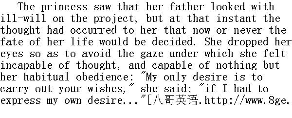公爵小姐看见父亲不怀好意地看待这件事, 但是就在那同一瞬间她心中想到, 她一生的命运或者是现在决定, 或者是永远不能决定。她垂下眼帘, 想不和父亲的目光相遇, 在他的目光影响下, 他觉得她不能思索, 只能习惯地唯唯诺诺, 她说道: "我所希望的只有一点--履行您的意旨, "她说。"假如要我表示自己的愿望......" She had not time to finish. The prince cut her short. "Very good, then!" he shouted. "He shall take you with your dowry, and hook on Mademoiselle Bourienne into the bargain. She'll be his wife, while you..." The prince stopped. He noticed the effect of these words on his daughter. She had bowed her head and was beginning to cry. 她还没有来得及说完, 公爵就打断了她的话。"妙极了!"他喊道。"他要把你连同嫁妆一起带走, 顺带也把布里安小姐带走。她以后当个太太, 而你......"公爵停了下来。他发现这席话对女儿所产生的影响。她低下头, 想要哭出声来。 "Come, come, I was joking, I was joking," he said. "Remember one thing, princess; I stick to my principles, that a girl has a full right to choose. And I give you complete freedom. Remember one thing; the happiness of your life depends on your decision. No need to talk about me."" 也罢, 也罢, 我在开玩笑, 我在开玩笑, "他说。"要记住一点, 公爵小姐, 我遵守那种做人的原则, 少女有选择对象的充分权利。我赐予你以自由。要记住一点: 你一生的幸福有赖于你作出的决定。关于我是没有什么可说的。" "But I don't know...father." "monpeve, 不过我不知道......"