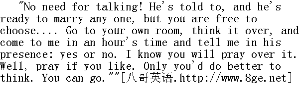 (父亲), 我怎样才能理解您的意思?"公爵小姐脸上红一阵, 白一阵, 她这样说。 "How understand me!" cried her father angrily. "Prince Vassily finds you to his taste as a daughter-in-law, and makes you a proposal for his protege. That's how to understand it. How understand it!... Why, I ask you."" 怎样才能理解呀!"父亲怒气冲冲地喊道。"瓦西里公爵照他自己的口味找你做个儿媳妇, 替他培养的人向你求婚。就是要这么理解。怎么理解吗?!由我来问你。" "I don't know how you, mon pere..." the princess articulated in a whisper. "monpeve, 我不知道您要怎么样。"公爵小姐轻言细语地说。 "I? I? what have I to do with it? leave me out of the question. I am not going to be married. What do you say? that's what it's desirable to learn."" 我?我?我怎么样?甭管我吧。又不是我要嫁人。您怎么样, 就是要知道这点。"