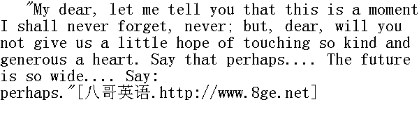 "Machere, jevousdirai, quec'estunmonentquejen'oublieraijamais, jamais, mais, mabonne, est-cequevousnenousdonnerezpasunpeud'esperancedetouchercecoeursibon, sigenereux Dites, quepeut-etre...L'avenirestsigrand.Ditespeut-etre."① ①法语: 亲爱的, 我告诉您, 我永远不能忘记这个时刻, 但是, 我的最慈爱的, 让我们即令怀有一线希望去触动这颗仁慈而宽厚的心吧。您告诉我, 也许......前途无量。您告诉我, 也许。 "Prince, what I have said is all that is in my heart. I thank you for the honour you do me, but I shall never be your son's wife."" 公爵, 我所说的就是我心里要说的一切。我感谢您的诚意, 赐予我荣幸, 可是我永远不会做您儿子的妻子。" "Well, then it's all over, my dear fellow. Very glad to have seen you, very glad to have seen you. Go to your room, princess; go along now," said the old prince. "Very, very glad to have seen you," he repeated, embracing Prince Vassily." 我亲爱的, 得啦吧, 要说的话说完了。看见你我很高兴, 看见你我很高兴。到自己房里去吧, 公爵小姐, 去吧, "老公爵说道。"看见你我很--很高兴。"他一面拥抱瓦西里公爵, 一面重说这句话。