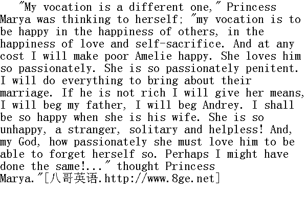 我的使命是另一种使命, "公爵小姐玛丽亚想道, "我的使命是借助另一种幸福, 借助仁爱和自我牺牲的幸福使自己成为幸福的人。无论我付出何种代价, 我都要替可怜的阿梅莉缔造幸福。她是那样酷爱他。她是那样沉痛地懊悔。我要竭尽全力为他们安排婚事。假如他不富裕, 我就给她金钱, 我要乞求于父亲, 乞求于安德烈。假如她会成为他的妻子, 我是何等幸福。她那样不幸, 身居异地, 孤立无援!我的天啊, 既然她会把自己遗忘, 可见她多么爱他。说不定, 我也会做出同样的事!......"公爵小姐玛丽亚想道。
