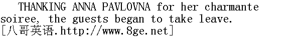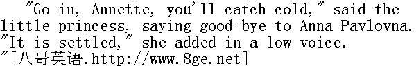 安内特,您进去吧,您会伤风的,"矮小的公爵夫人一面向安娜?帕夫洛夫娜告辞,一面对她说。"C'estarrete①,"她放低嗓门补充说。 ①法语: 就这样确定了。 Anna Pavlovna had managed to have a few words with Liza about the match she was planning between Anatole and the sister-in-law of the little princess. 安娜?帕夫洛夫娜已经和丽莎商谈过她想要给阿纳托利和矮小的公爵夫人的小姑子说媒的事情。 "I rely on you, my dear," said Anna Pavlovna, also in an undertone; "you write to her and tell me how the father will view the matter. Au revoir!" And she went back out of the hall. " 亲爱的朋友,我信任您了,"安娜?帕夫洛夫娜也放低嗓门说道,"您给她写封信,再告诉我,commentlepereenvisBageralachose.Aurevoir②。"她于是离开招待室。 ②法语: 您父亲对这件事的看法。再会。